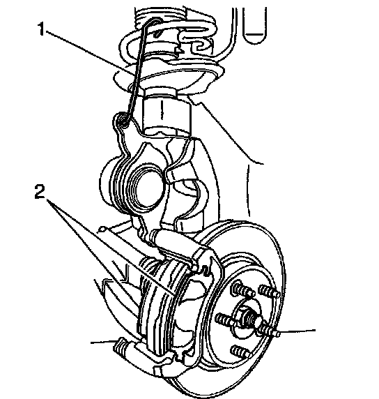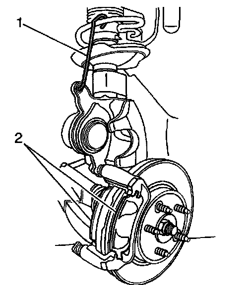 1. Remove the brake caliper from the brake caliper mounting bracket and support the brake caliper with heavy mechanic's wire (1) or equivalent. Do NOT disconnect the hydraulic brake flexible hose from the caliper.