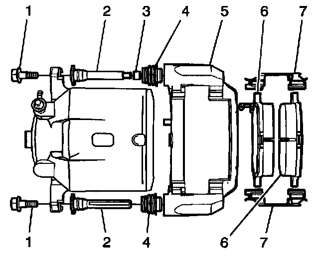 9. Inspect the caliper bracket (5). If the brake caliper bracket (5) is bent, cracked, or damaged, it requires replacement.