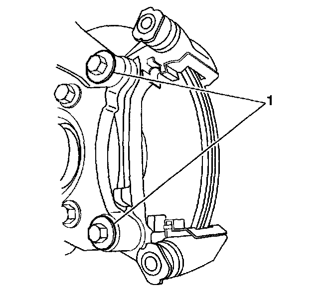 7. Remove the brake caliper mounting bracket bolts (1).