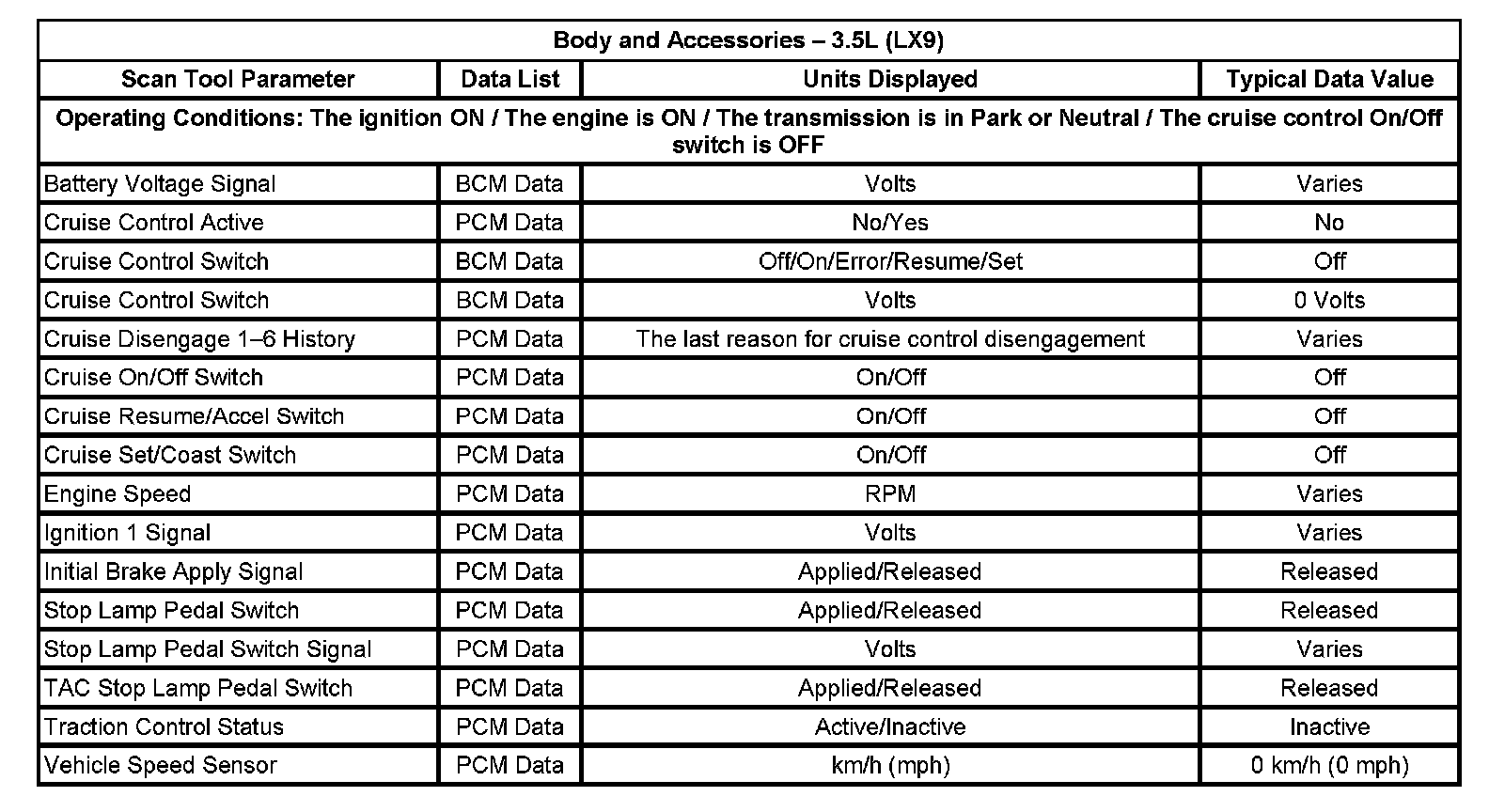 The scan tool data lists contain all of the cruise control related parameters that are available on the scan tool. The parameters in the list are arranged in alphabetical order. The data list column indicates the location of the parameter within the scan tool menu selections.