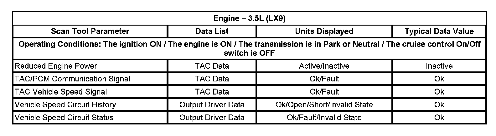 The typical data values are obtained from a properly operating vehicle under the conditions specified in the first row of the scan tool data list table. Comparison of the parameter values from the suspect vehicle with the typical data values may reveal the source of the customer concern.