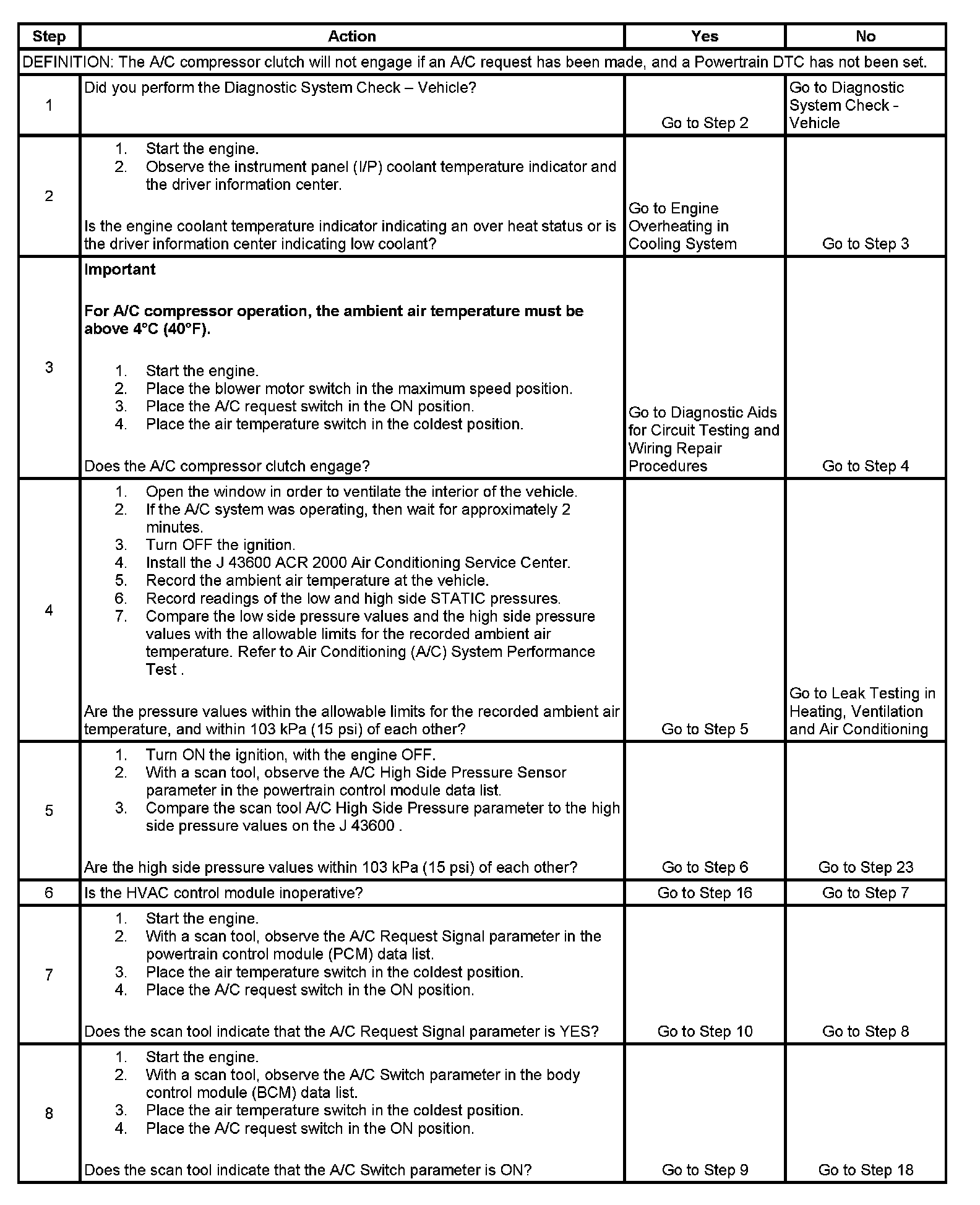 2. The A/C compressor relay output is disabled if engine coolant temperature is above 128°C (262°F). The instrument panel engine coolant indicator will indicate overheating.