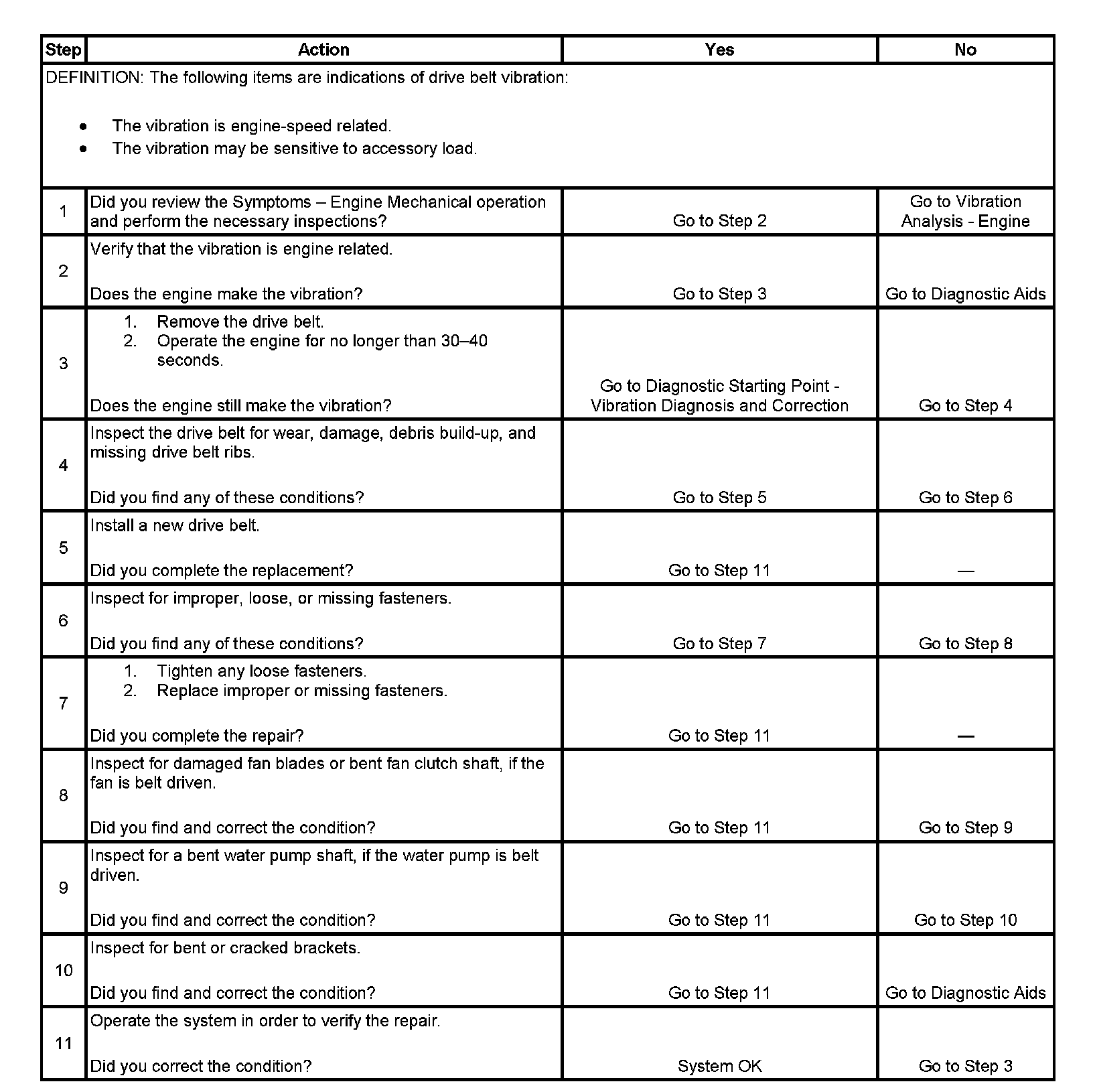 3. This test is to verify that the drive belts or accessory drive components may be causing the vibration. When removing the drive belt, the water pump may not be operating and the engine may overheat. Also DTCs may set when the engine is operating with the drive belt removed.