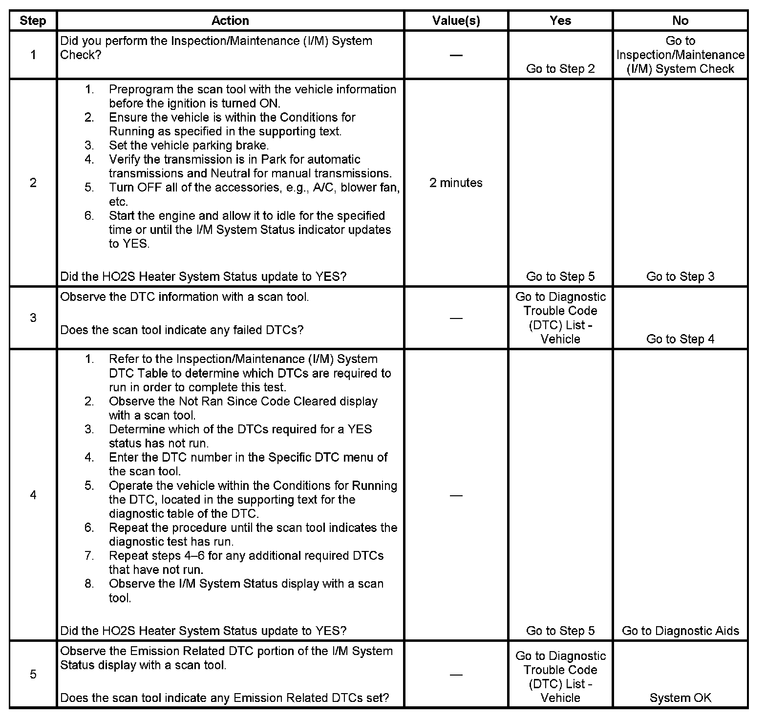 The purpose of this test is to satisfy the enable criteria necessary to execute inspection/maintenance (I/M) readiness diagnostics for the heated oxygen sensor (HO2S) system. The test may be used to set the I/M System Status to YES. The I/M System Status display on the scan tool provides an indication of whether the control module has completed the required tests. The I/M System Status does not indicate that the tests have passed or failed. When all of the diagnostics for a specific system have run and passed, the I/M System Status will update to YES. If a test for a specific system has failed, the I/M System Status will update to YES, indicating a determination was made, even if all of the other tests for that system have not run.