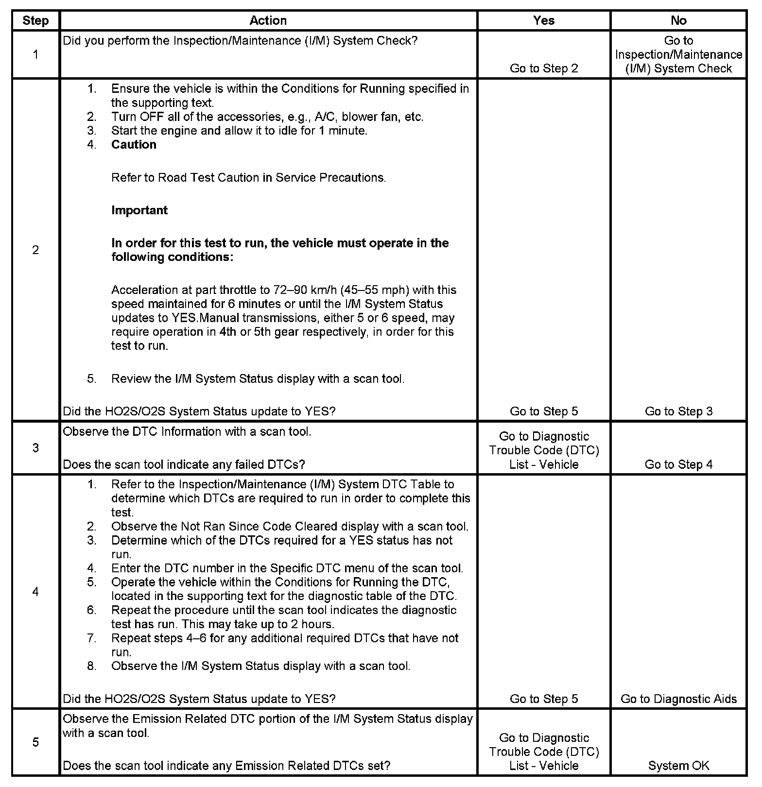The purpose of this test is to satisfy the enable criteria necessary to execute inspection/maintenance (I/M) readiness diagnostics for the heated oxygen sensor (HO2S)/oxygen sensor (O2S) system. The test may be used to set the I/M System Status to YES. The I/M System Status display on the scan tool provides an indication of whether the control module has completed the required test. The required test is complete when either all of the DTCs comprising the test have run and passed, or when any one of the DTCs comprising the test has illuminated the malfunction indicator lamp (MIL). Once the test is complete, the I/M System Status display will indicate YES in the Completed column.