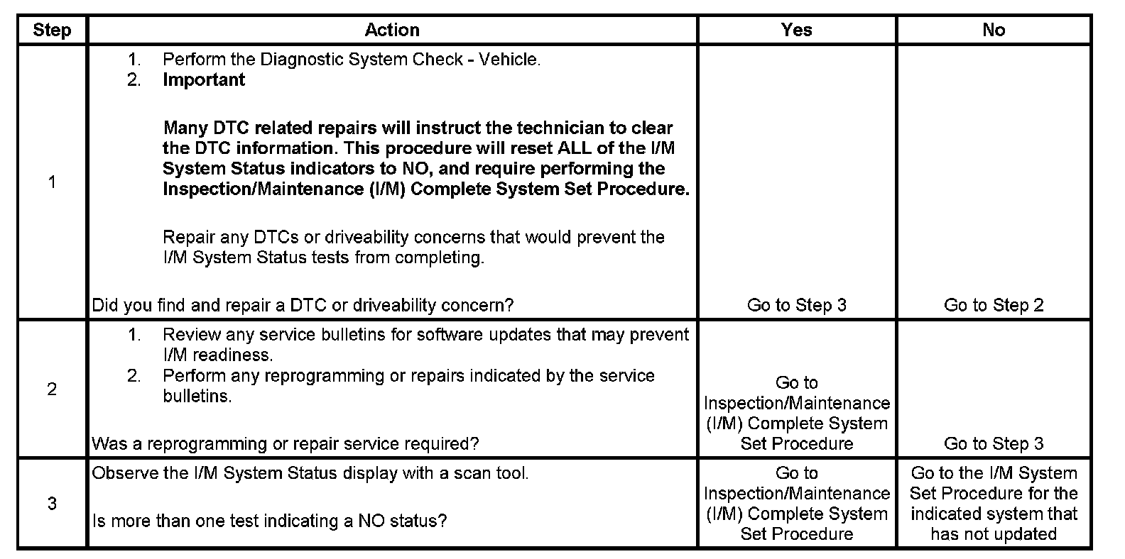 For the specific DTCs required for each system, refer to Inspection/Maintenance (I/M) System DTC Table. Systems such as fuel delivery, misfire, and comprehensive components may not be listed in a system status list. These tests run continuously and do not require an I/M System Status indicator. Inspection/Maitenance (I/M) System (DTC) Table