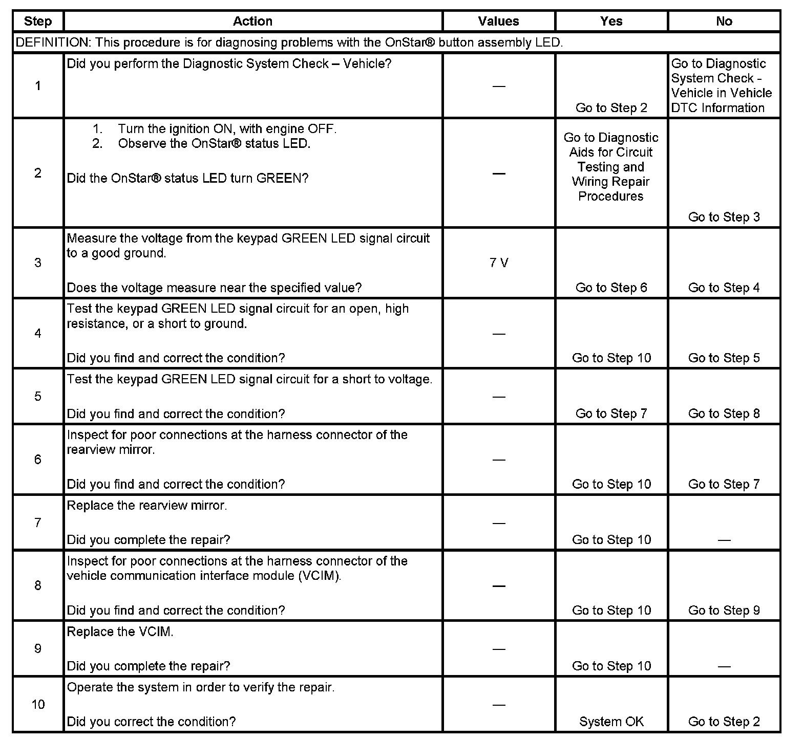5. If the GREEN LED signal is shorted to voltage, then the OnStar(R) 3-button assembly has been damaged and must be replaced.