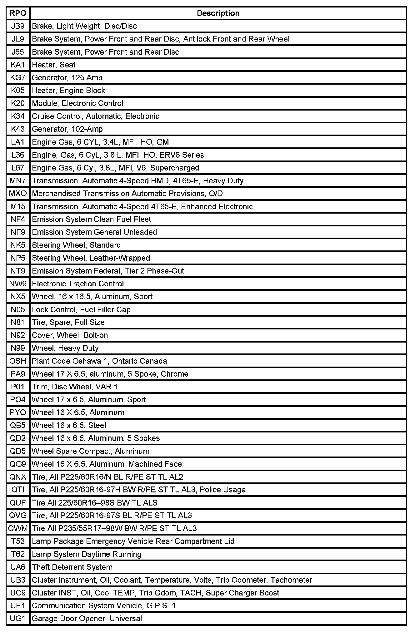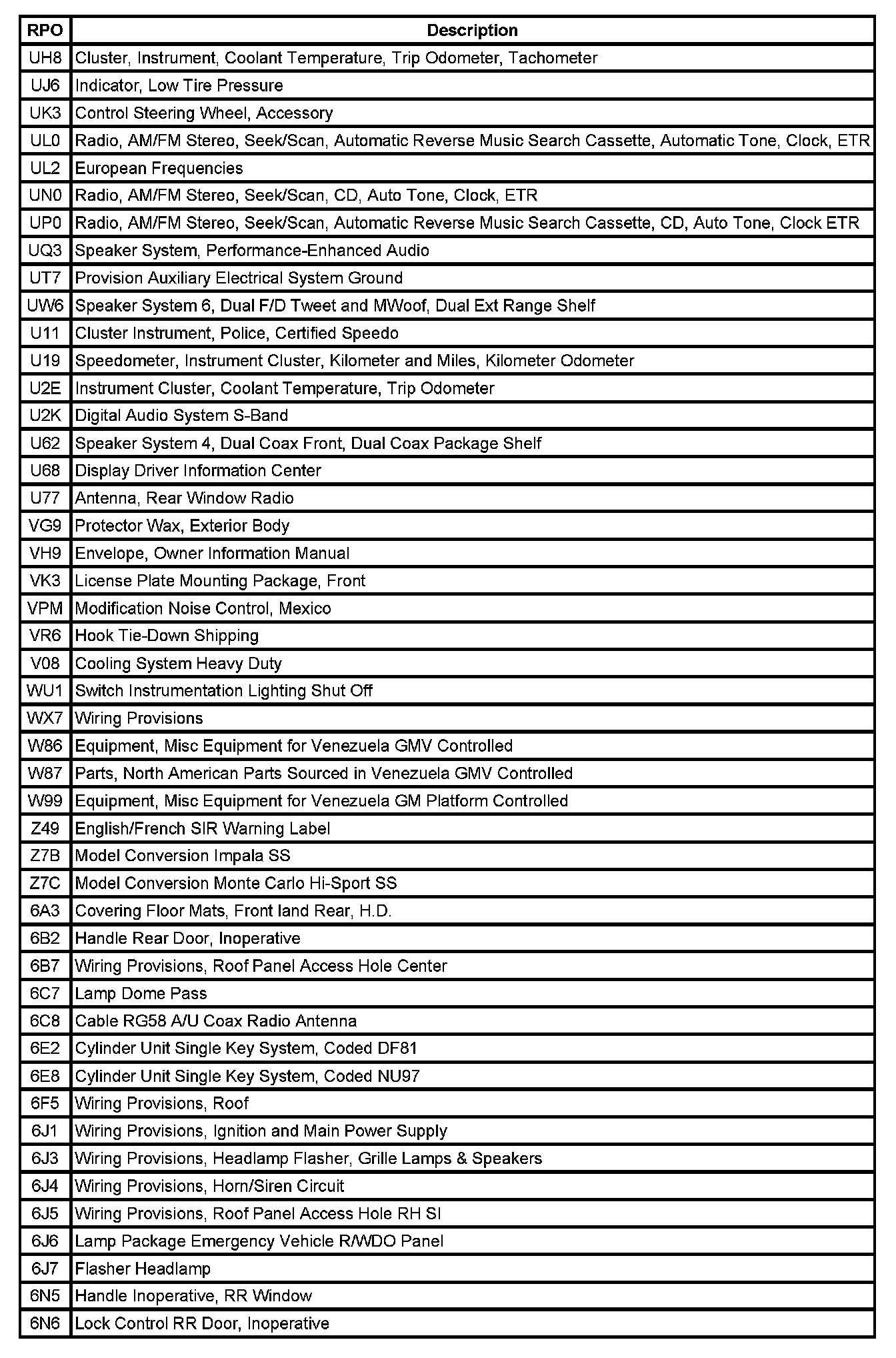 The table provides the description of the Regular Production Option (RPO) codes that are available on the vehicle. The vehicle's RPO list is printed on the Service Parts Identification Label.