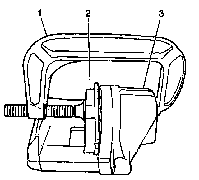 ^ For single piston caliper applications, insert a discarded inner brake pad (2) or block of wood in front of the piston. Using a large C-clamp (1) installed over the body of the caliper (3) and against the brake pad or block of wood, slowly bottom the piston in the bore.