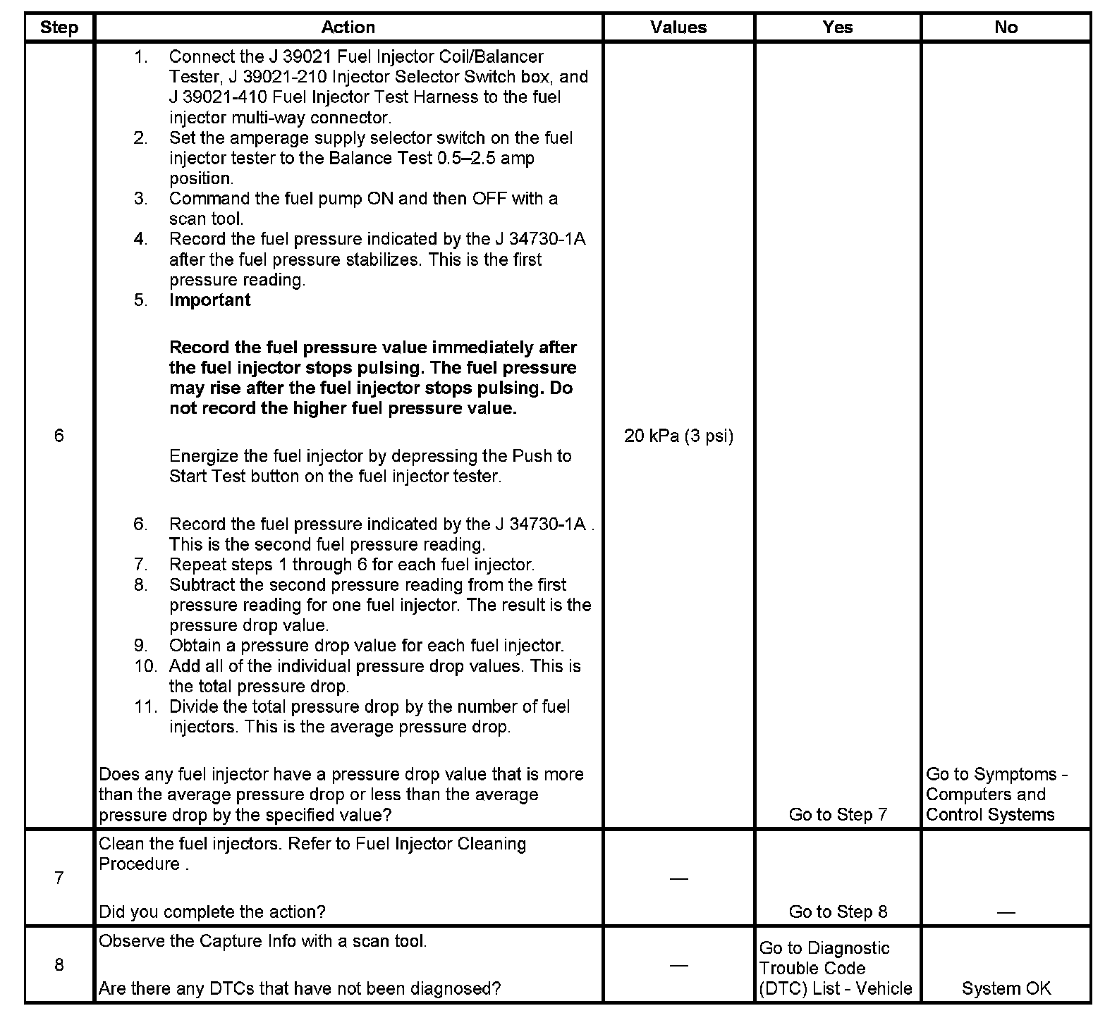 6. If the pressure drop value for each fuel injector is within 20 kPa (3 psi) of the average pressure drop value, the fuel injectors are flowing properly.