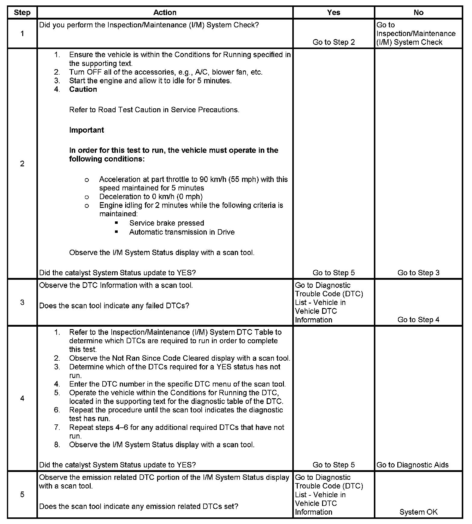 The purpose of this test is to satisfy the enable criteria necessary to execute inspection/maintenance (I/M) readiness diagnostics for the catalyst system. The test may be used to set the I/M System Status indicators to YES. The I/M System Status display on the scan tool provides an indication of whether the control module has completed the required tests. The I/M System Status does not indicate that the tests have passed or failed. When all of the diagnostics for a specific system have run and passed, the I/M System Status will update to YES. If a test for a specific system has failed, the I/M System Status will update to YES, indicating a determination was made even if all of the other tests for that system have not run.