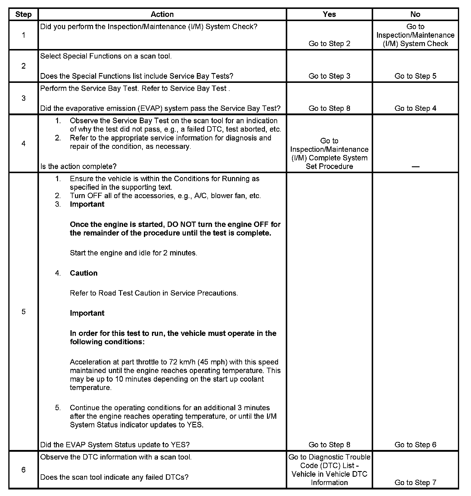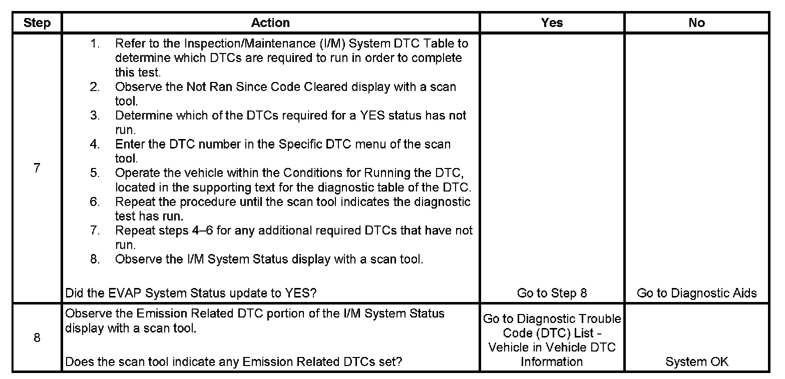 The purpose of this test is to satisfy the enable criteria necessary to execute inspection/maintenance (I/M) readiness diagnostics for the evaporative emission (EVAP) system. The test may be used to set the I/M System Status indicators to YES. The I/M System Status display on the scan tool indicates whether or not the control module has completed the required test. The required test is complete when either all of the DTCs comprising the test have run and passed, or when any one of the DTCs comprising the test has illuminated the malfunction indicator lamp (MIL). Once the test is complete, the I/M System Status display will indicate YES in the completed column. Performing a visual inspection prior to running the EVAP test may prevent having to repeat the test due to the fact that a failed or aborted test will require the vehicle to cool down in order to meet the enable criteria to run another test.