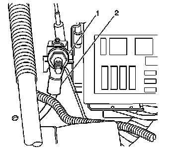 6. Remove the positive battery cable (2) from the underhood accessory wiring junction block.