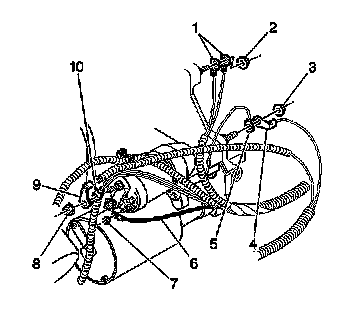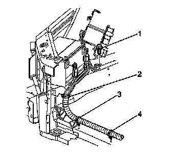 2. Install the battery cable harness to the retainers (2,3,4).