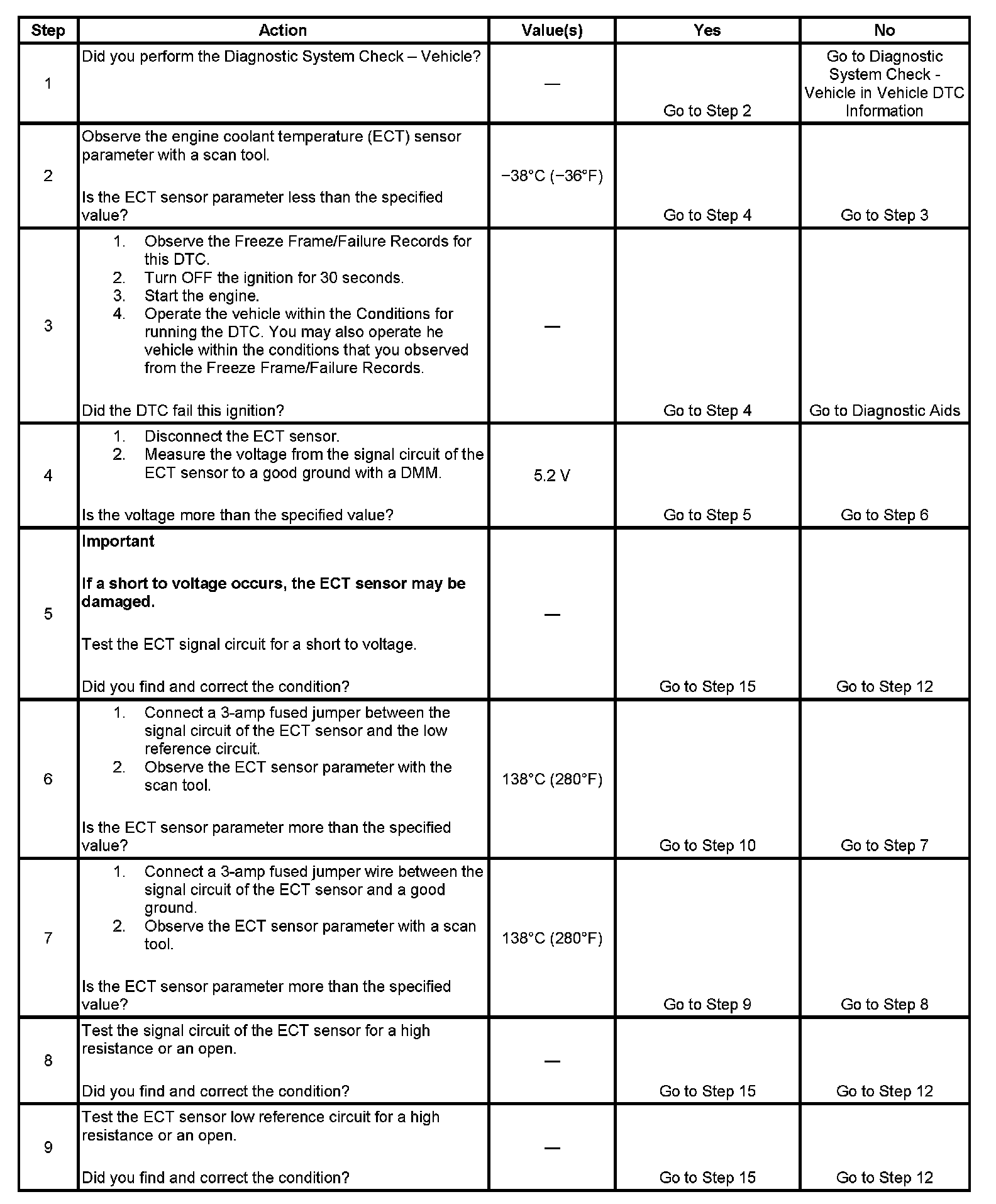 The engine coolant temperature (ECT) sensor is a variable resistor, that measures the temperature of the engine coolant. The ECT sensor has a signal circuit and a low reference circuit. The powertrain control module (PCM) supplies 5 volts to the ECT signal circuit and a ground for the ECT low reference circuit. When the ECT is cold, the sensor resistance is high. When the ECT increases, the sensor resistance decreases. With high sensor resistance, the PCM detects a high voltage on the ECT signal circuit. With lower sensor resistance, the PCM detects a lower voltage on the ECT signal circuit. If the PCM detects an excessively high ECT signal voltage, which is a low temperature indication, DTC P0118 sets.