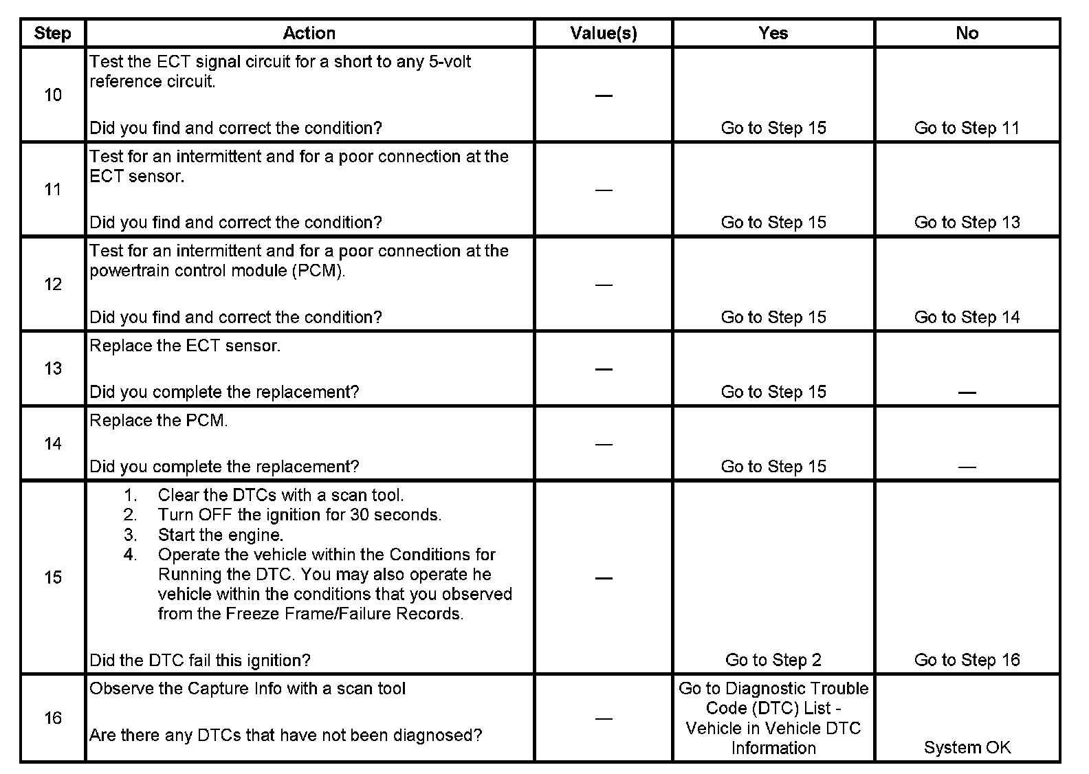 - If a short to a separate voltage source occurs, this DTC may set and damage the ECT sensor. After starting the engine, the ECT should rise steadily, then stabilize after the thermostat opens.