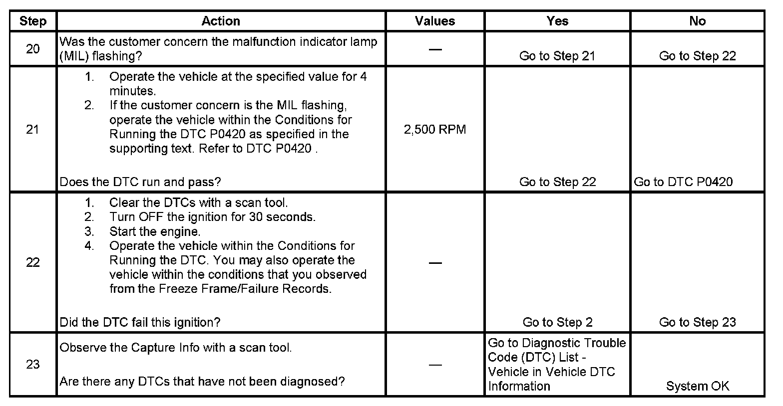 - DTCs P0101, P0102, P0103, P0107, P0108, P0116, P0117, P0118, P0121, P0122, P0123, P0125, if applicable, P0128, P0315, P0335, P0336, P0340, P0341, P0350, P0502, P0503, P1350 are not set.