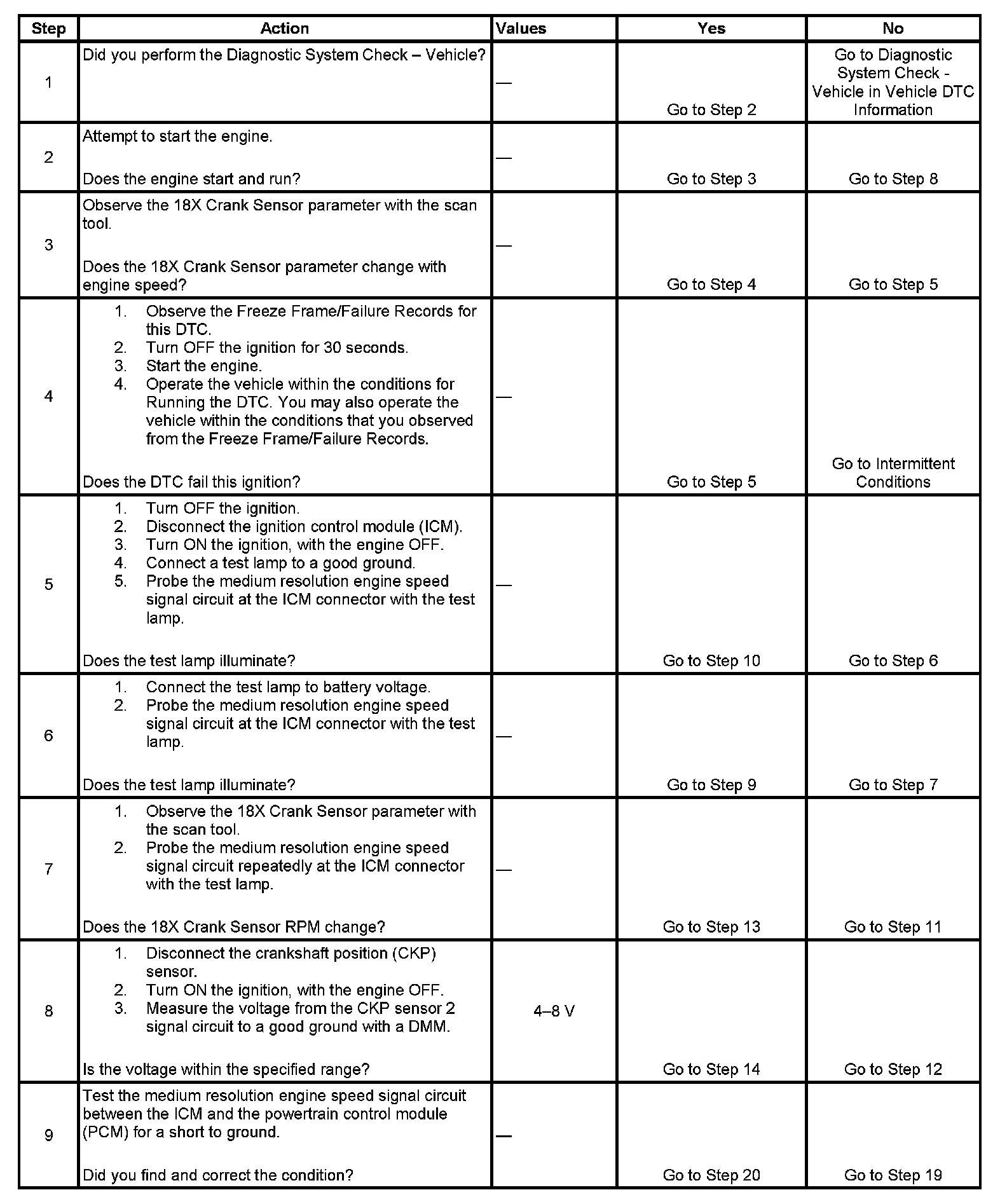 The ICM uses the sensors to determine the engine position and speed. A signal converter within the ICM, using the CKP sensor 1 18X pulse, produces a digital 18X output signal to the powertrain control module (PCM) on the medium resolution engine speed signal circuit. The PCM monitors the medium resolution engine speed signal circuit for errors. If the PCM does not receive a signal from the ICM, DTC P0335 sets.