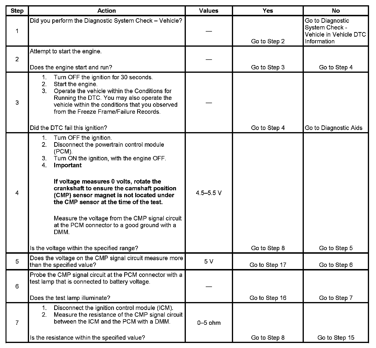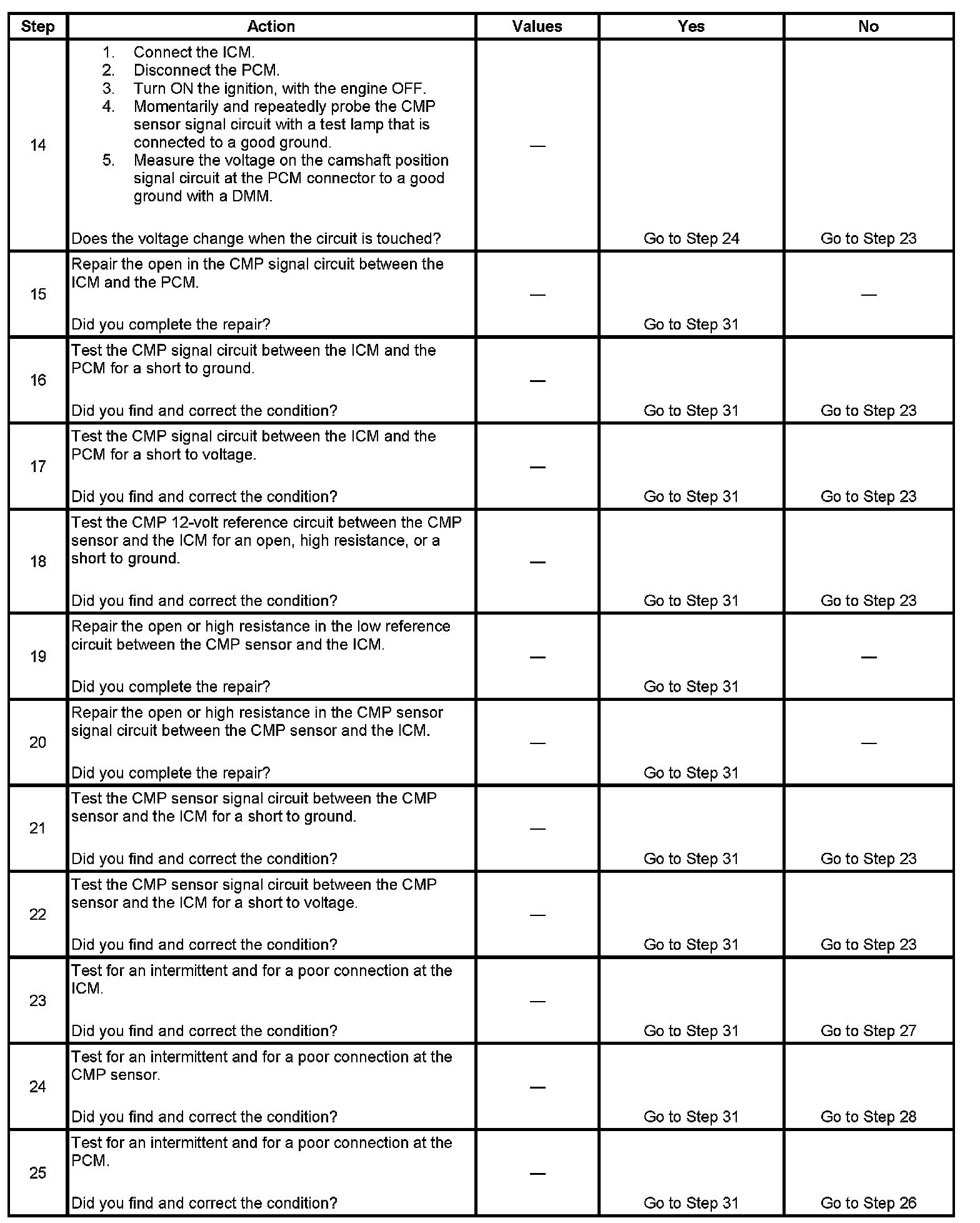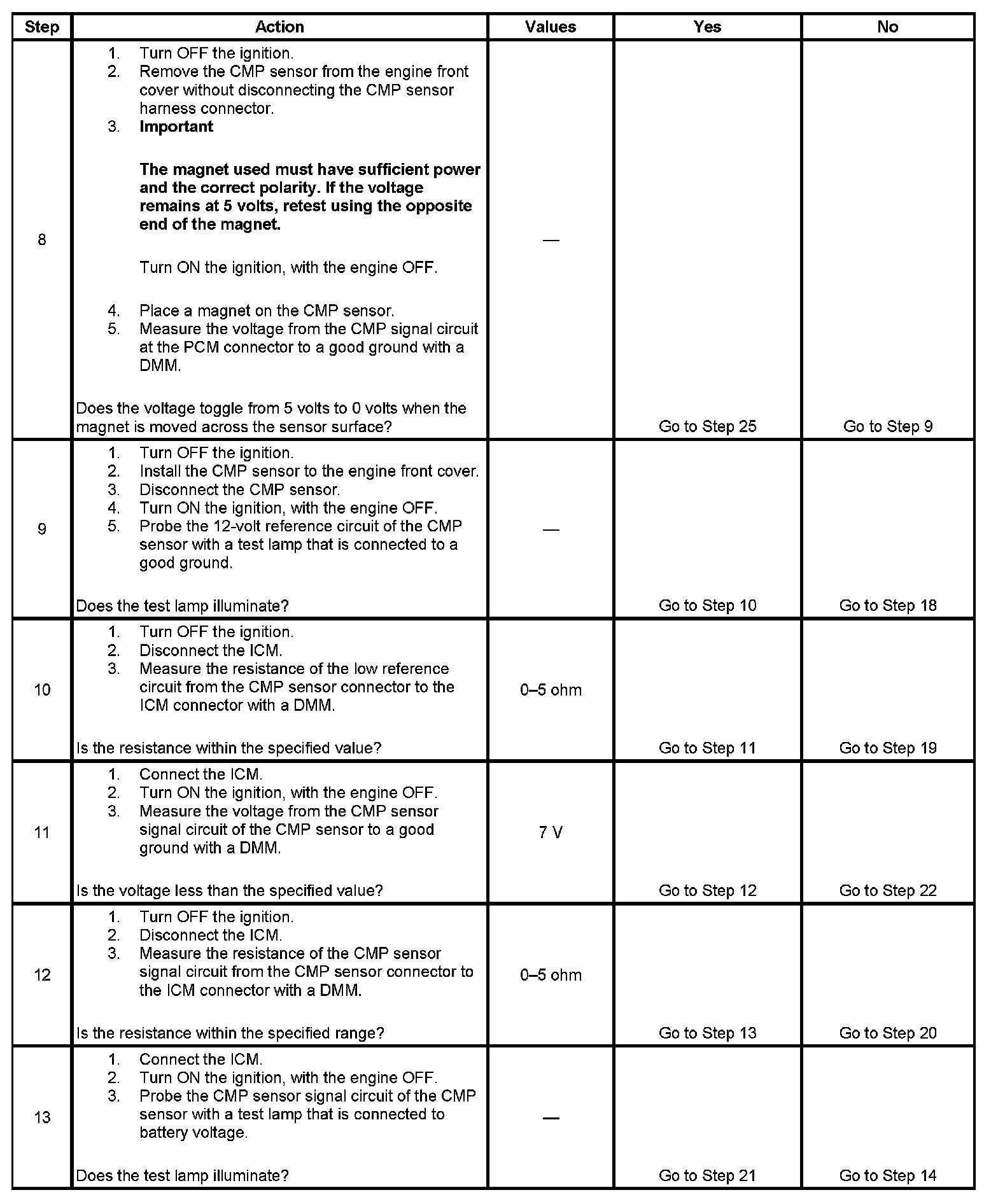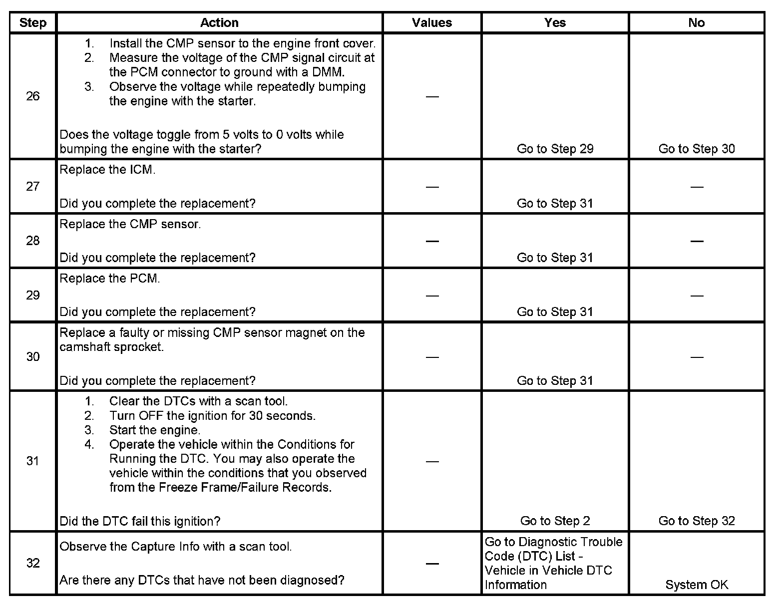 26. This step determines if the fault is caused by a missing camshaft magnet or by a faulty PCM. The voltage measured in this step should be near 5 volts, and decrease to near 0 volts when the CMP sensor interfaces with the camshaft magnet.