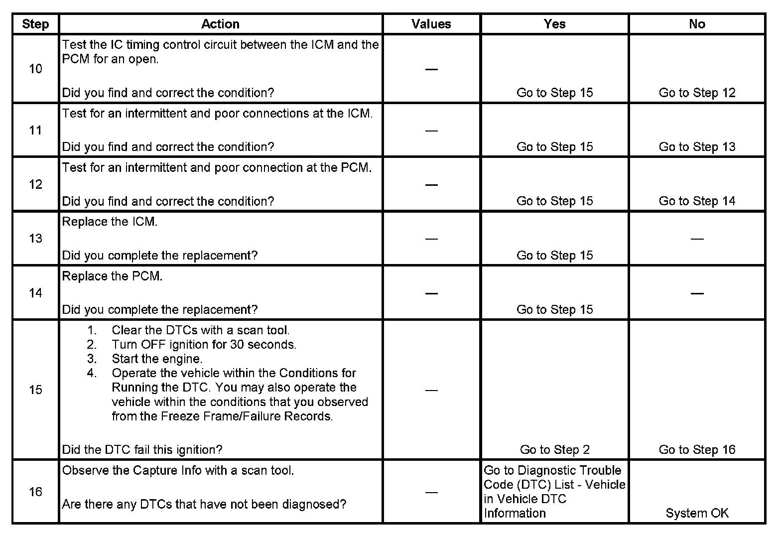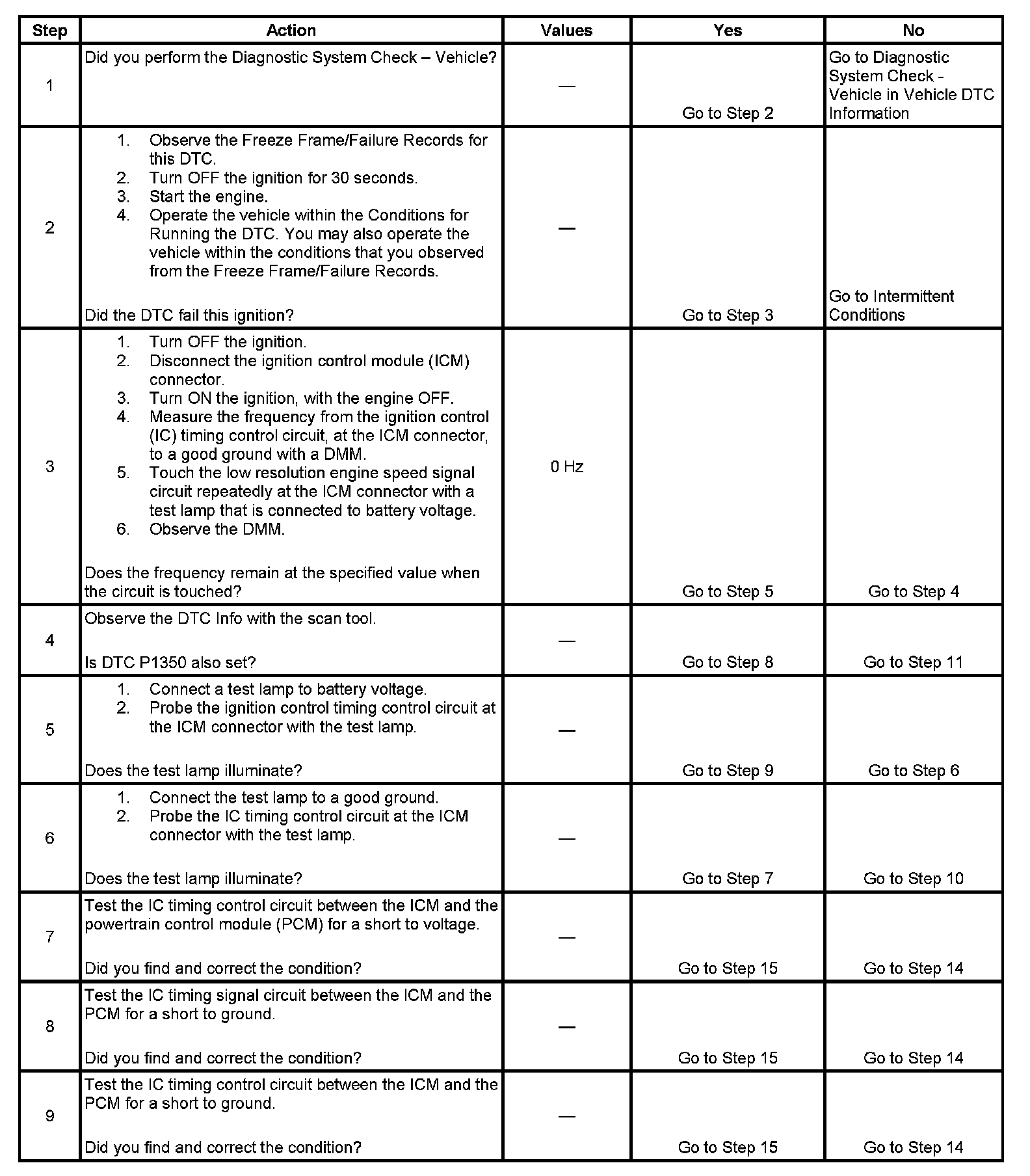 The PCM sends spark timing signals to the ICM on the IC timing control circuit, but during cranking the ICM grounds these signals. When the PCM begins receiving the 3X reference pulses from the ICM and the engine starts, the PCM applies 5 volts to the IC timing signal circuit allowing the ICM to switch to the IC mode of operation and respond to the spark timing signals from the PCM. The PCM monitors the IC timing control circuit for errors. If the PCM detects a fault, DTC P0350 sets.