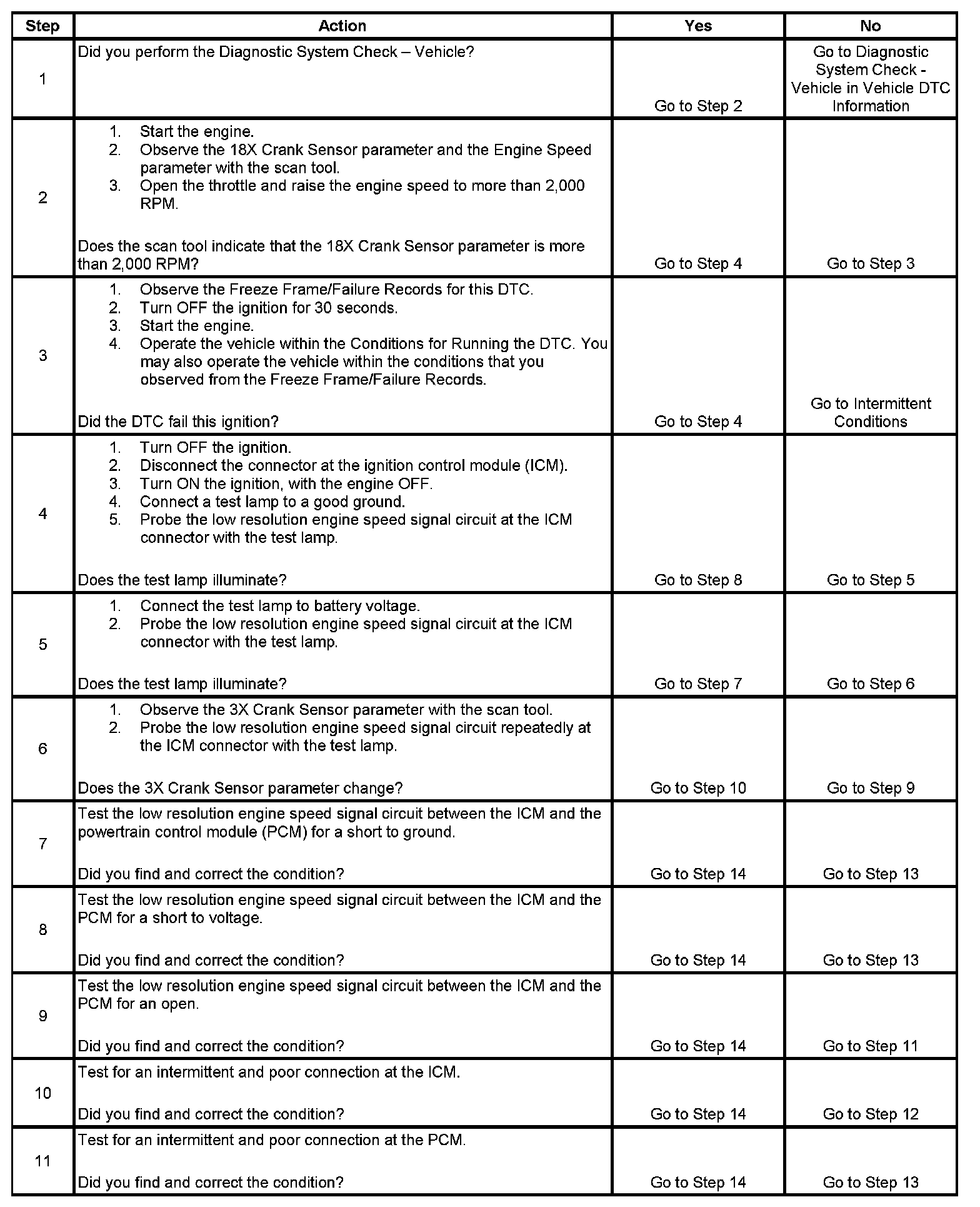 The ICM uses the sensors to determine the engine position and speed. A signal converter within the ICM, using the CKP sensor 1 18X pulse, produces a digital 3X output signal to the powertrain control module (PCM) on the low resolution engine speed signal circuit. The PCM monitors the low resolution engine speed signal circuit for errors. If the PCM does not receive a signal from the ICM, DTC P0385 sets.