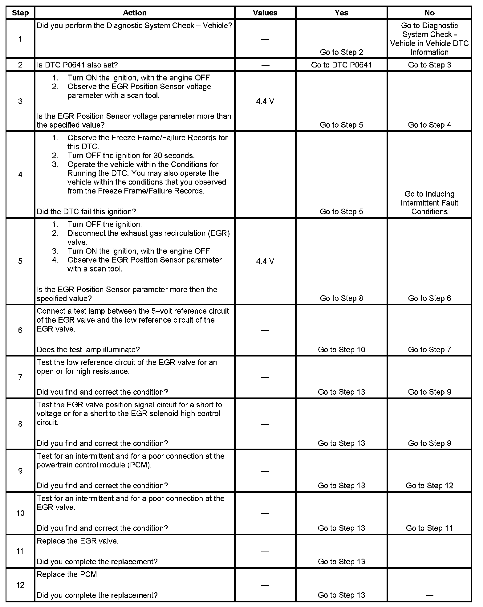 The exhaust gas recirculation (EGR) valve position sensor is monitored by the powertrain control module (PCM). The 5-volt reference circuit, low reference circuit and the EGR valve position signal circuit are used by the PCM to determine the EGR valve position. If the EGR valve position sensor signal voltage is more than a calibrated value, DTC P0406 sets.