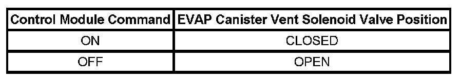 The table illustrates the relationship between the ON and OFF states, and the OPEN or CLOSED states of the EVAP canister vent solenoid valve.