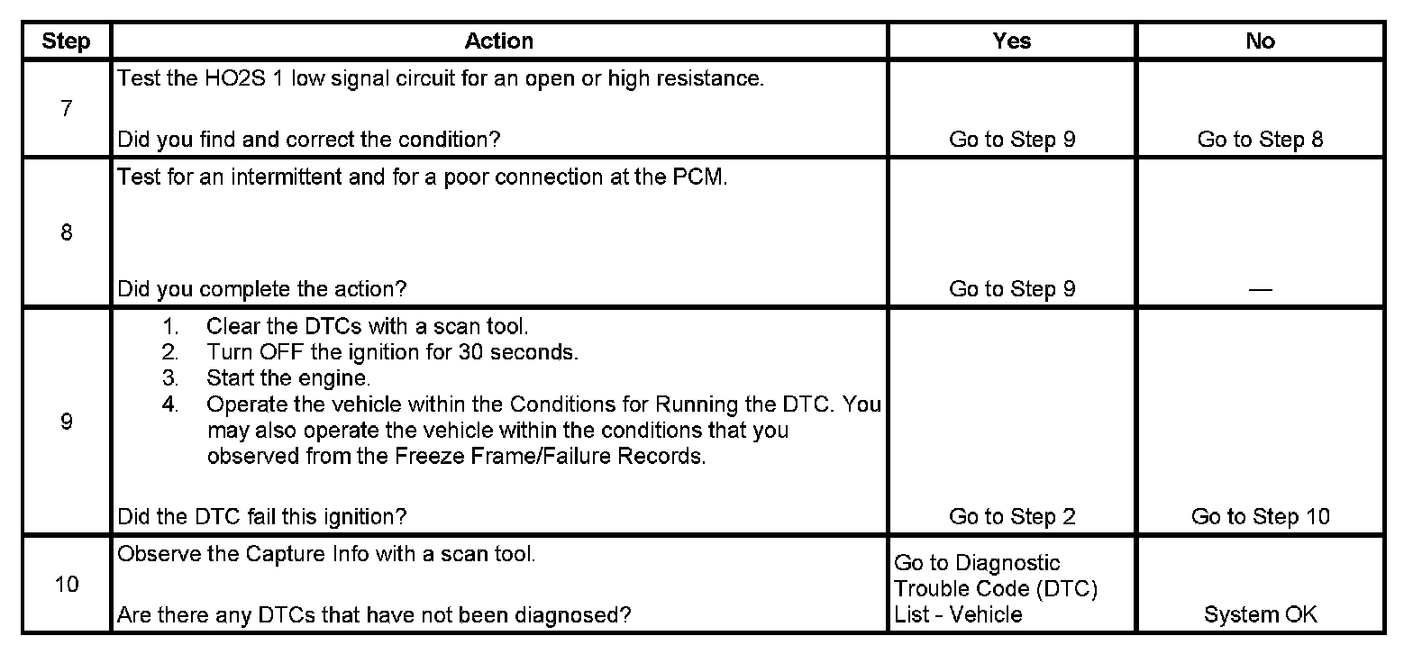 This DTC may set due to poor idle characteristics. A possible cause may be uncontrolled fueling due to an open or high resistance in the HO2S 1 low signal circuit. Before replacing any component, ensure that this condition does not exist.