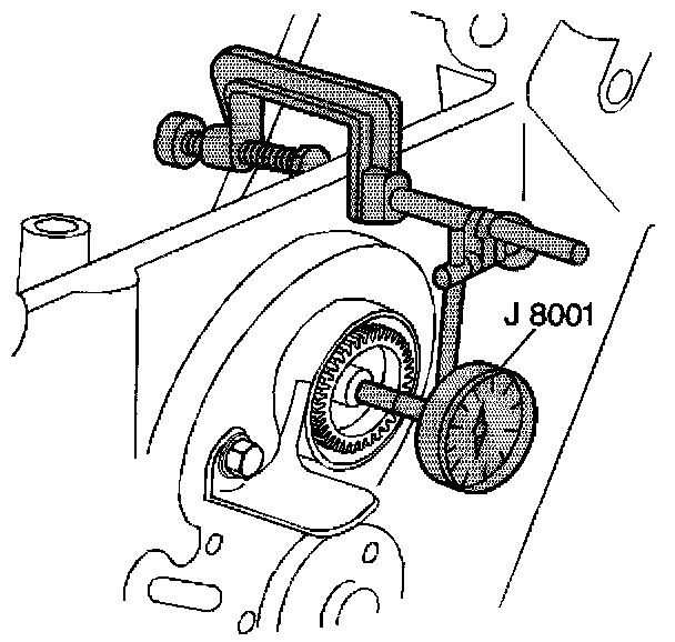 7. Using J 8001 measure the balance shaft radial play at the rear. Radial play must be between 0.0127 - 0.119 mm (0.0005 - 0.0047 inch).