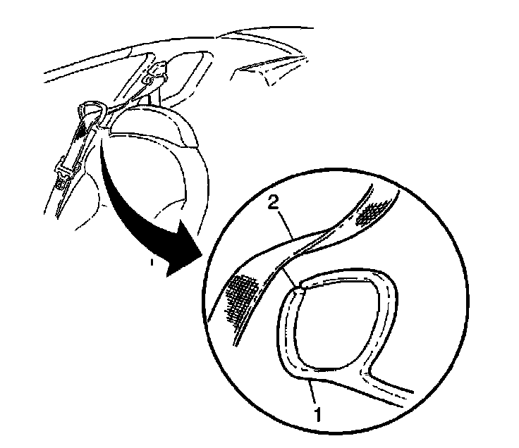 2. Remove the seat belt (2) from the seat belt guide (1) through the slit in the guide.