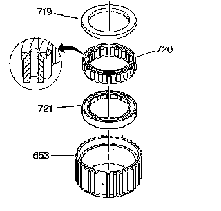 11. Insert the input and third clutch sprag center bearing (721) into the third clutch sprag outer race (653).