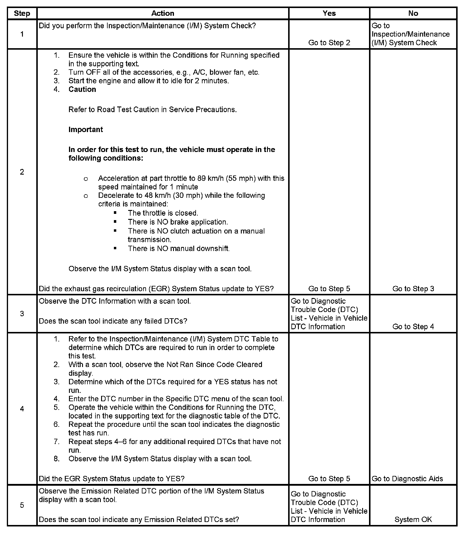 The control module only runs the EGR Active Tests during a gradual deceleration with a closed throttle and a vehicle speed above 48 km/h (30 mph). Several deceleration cycles may be necessary in order to accumulate a sufficient number of EGR flow samples. The procedure outlined in the table is for a clear, flat road. If the procedure is performed on a road with a slight down hill grade, the test may acquire the necessary sample counters in one or two decel trips. If the test is interrupted during the procedure, it may take more than 3 deceleration cycles to complete the test. If the status does not update, the test outlined in this procedure can be repeated until the I/M System Status updates to YES.
