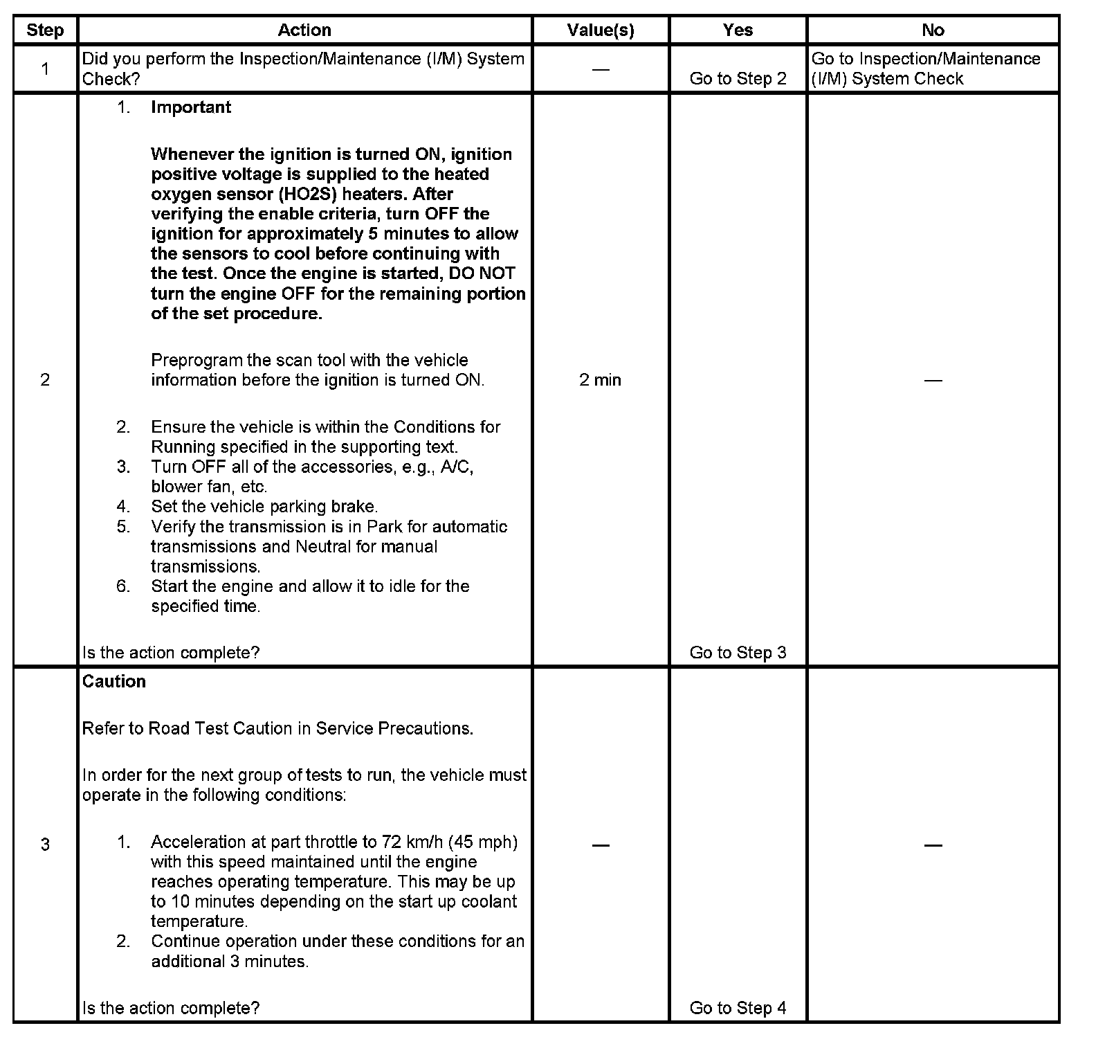 The scan tool can be used to monitor each of the I/M System Status indicators during the I/M complete system set procedure. When all of the indicators for a test step have updated to YES, testing can move on to the next step even if the remaining portion of the test is not complete. For example, step 3 is designed to run the EVAP, secondary air injection (AIR), and HO2S tests. The procedure instructs the technician to operate the vehicle in the enable conditions for 6 minutes. If all 3 tests have updated to YES within 4 minutes, it is not necessary to continue with the enable conditions and testing can advance to the next step.