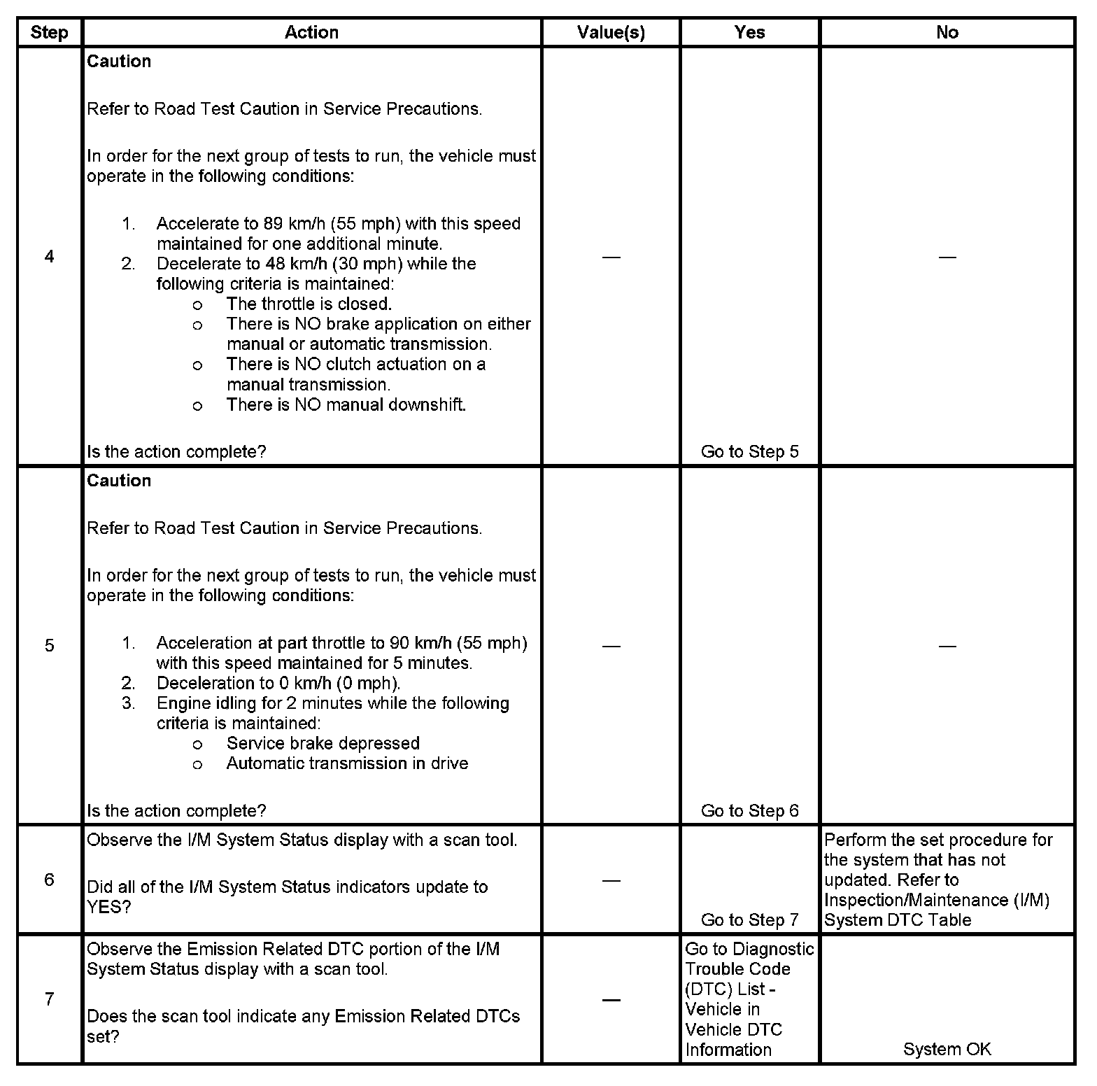 7. The I/M System Status only reports on whether or not a diagnostic has run, not what the outcome of the test was. If any emission related DTC sets after the tests are complete, the DTC will require diagnosis.
