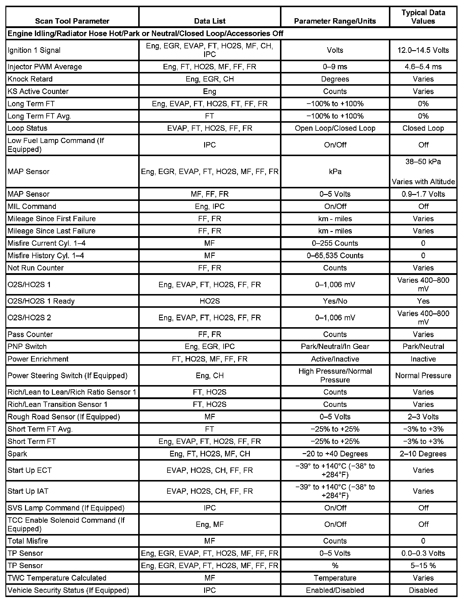 Scan tool values from an engine that is operating correctly may be used for comparison with the engine you are diagnosing. The Engine Scan Tool Data List represents the values that would be seen on a normal operating engine.