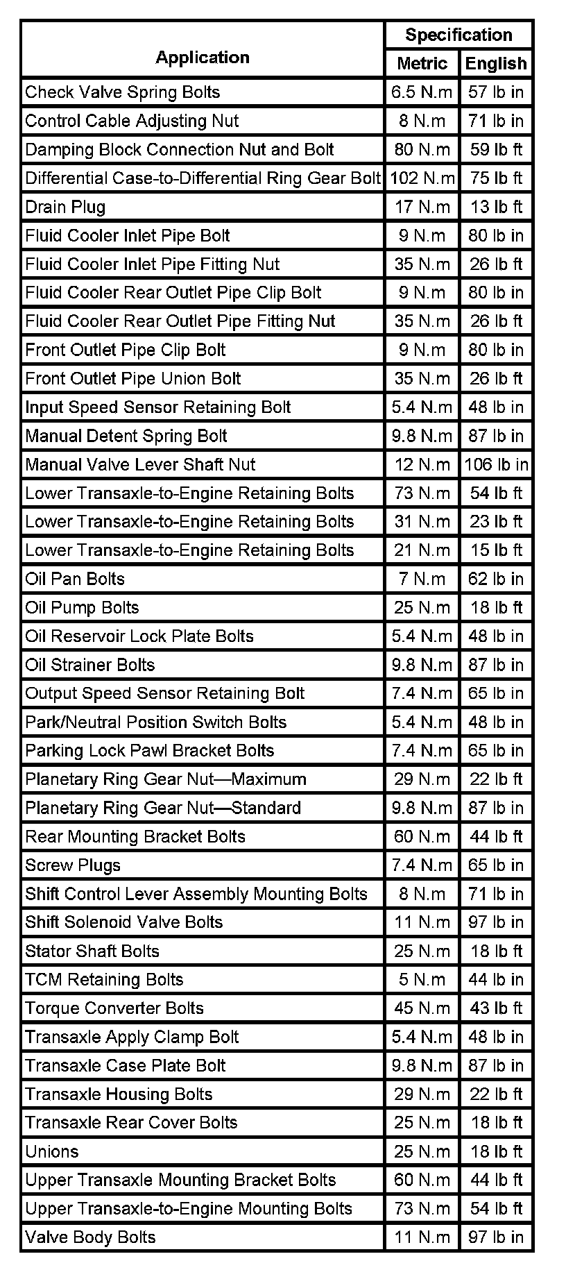 Fastener Tightening Specifications: