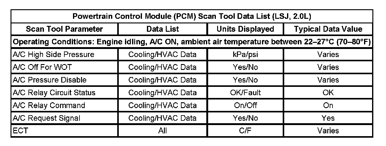 Powertrain Control Module (PCM) Scan Tool Data List: