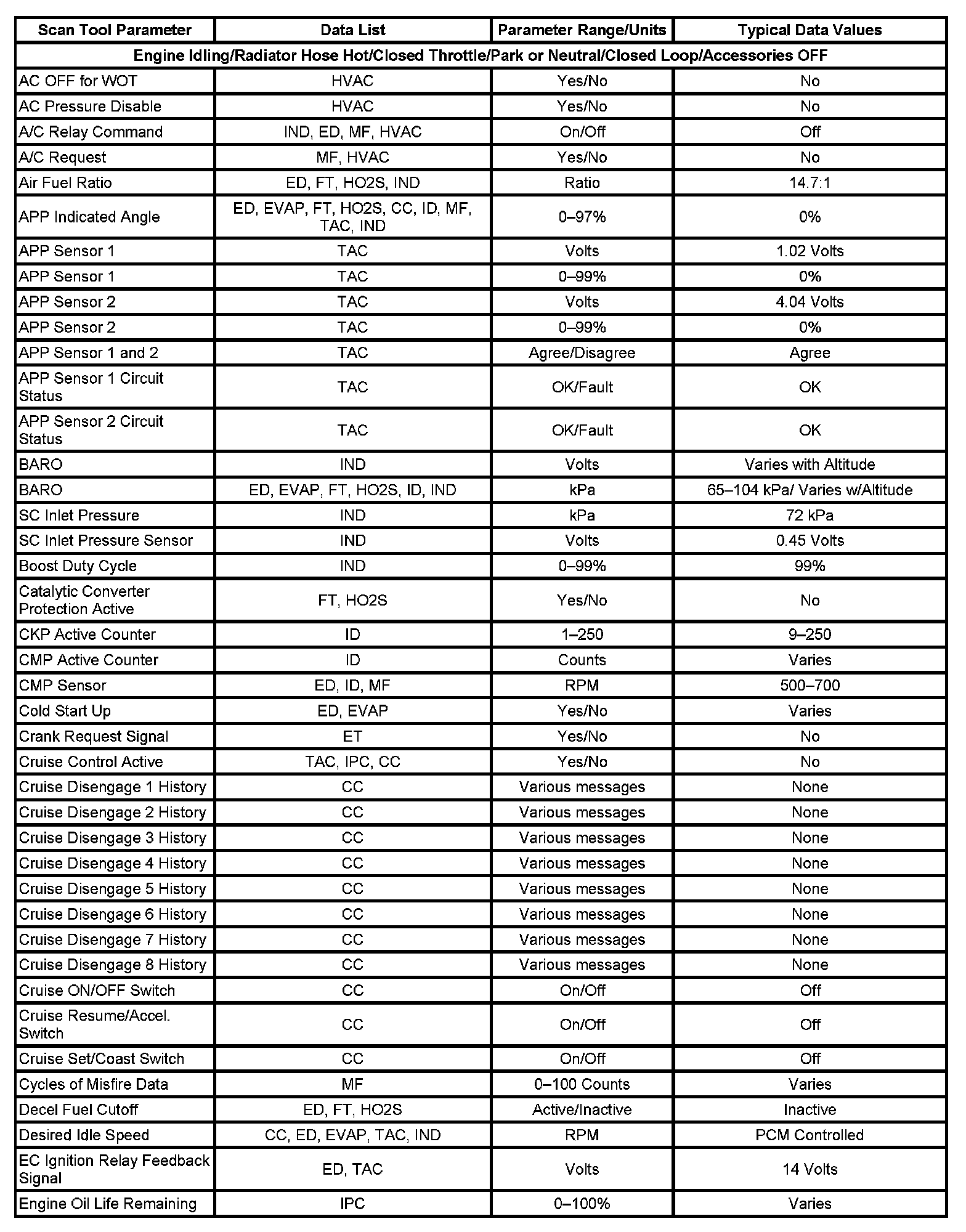 The Engine Scan Tool Data List contains all engine related parameters that are available on the scan tool. The list is arranged in alphabetical order. A given parameter may appear in any one of the data lists, and in some cases may appear more than once, or in more than one data list in order to group certain related parameters together.