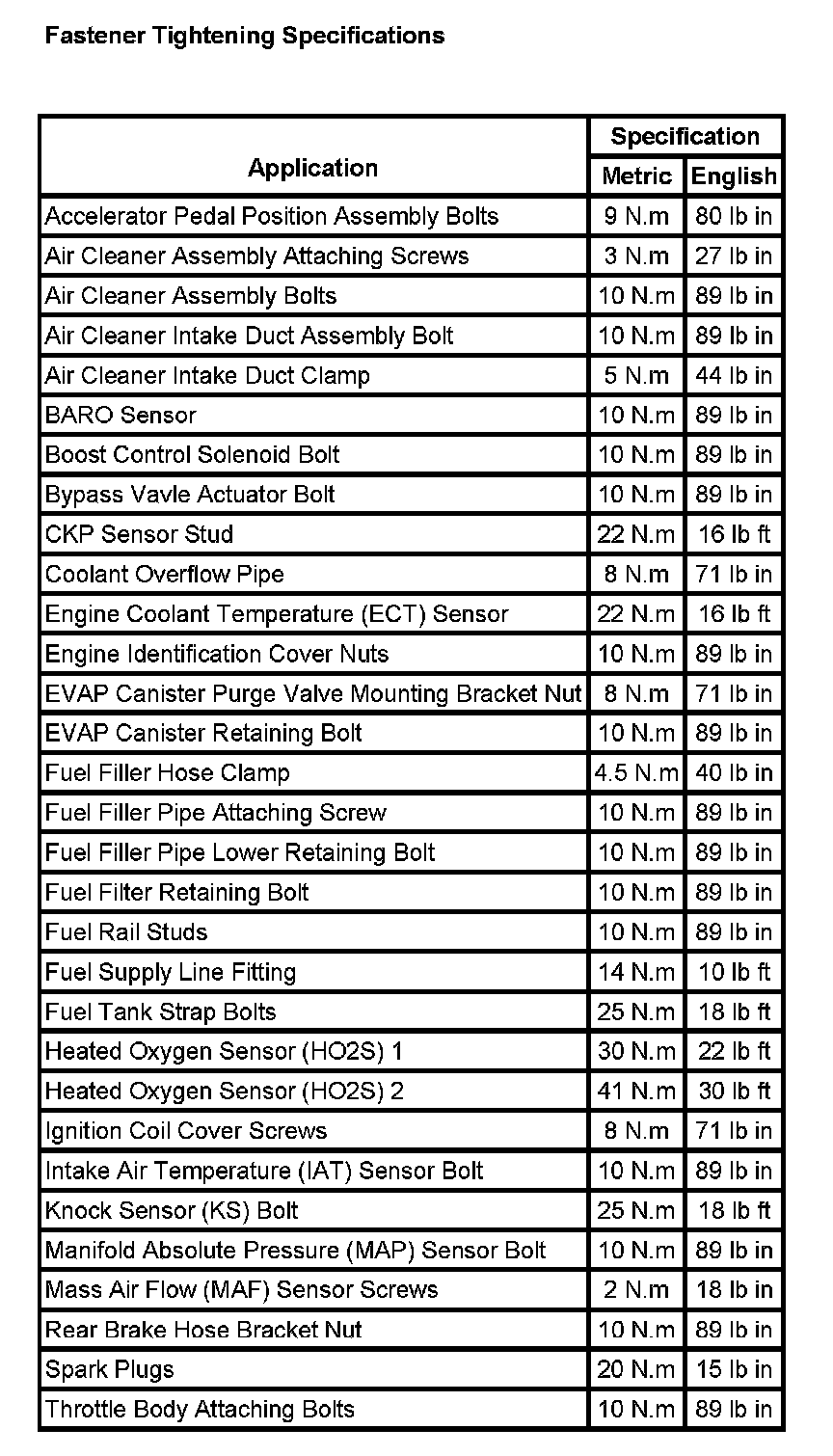 Fastener Tightening Specifications: