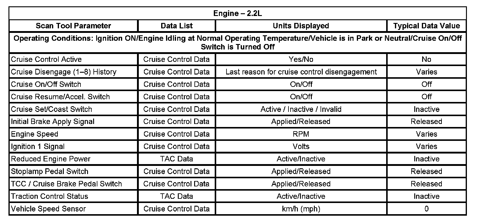 The typical data values are obtained from a properly operating vehicle under the conditions specified in the first row of the scan tool data list table. Comparison of the parameter values from the suspect vehicle with the typical data values may reveal the source of the customer concern.