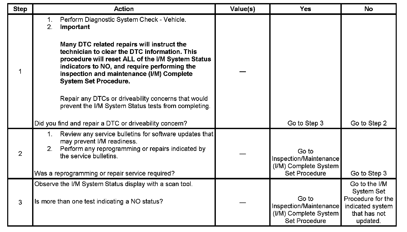 For the specific DTCs required for each system, refer to Inspection/Maintenance (I/M) System DTC Table. Systems such as fuel delivery, misfire, and comprehensive components may not be listed in a system status list. These tests run continuously and do not require an I/M System Status indicator. System DTC Table
