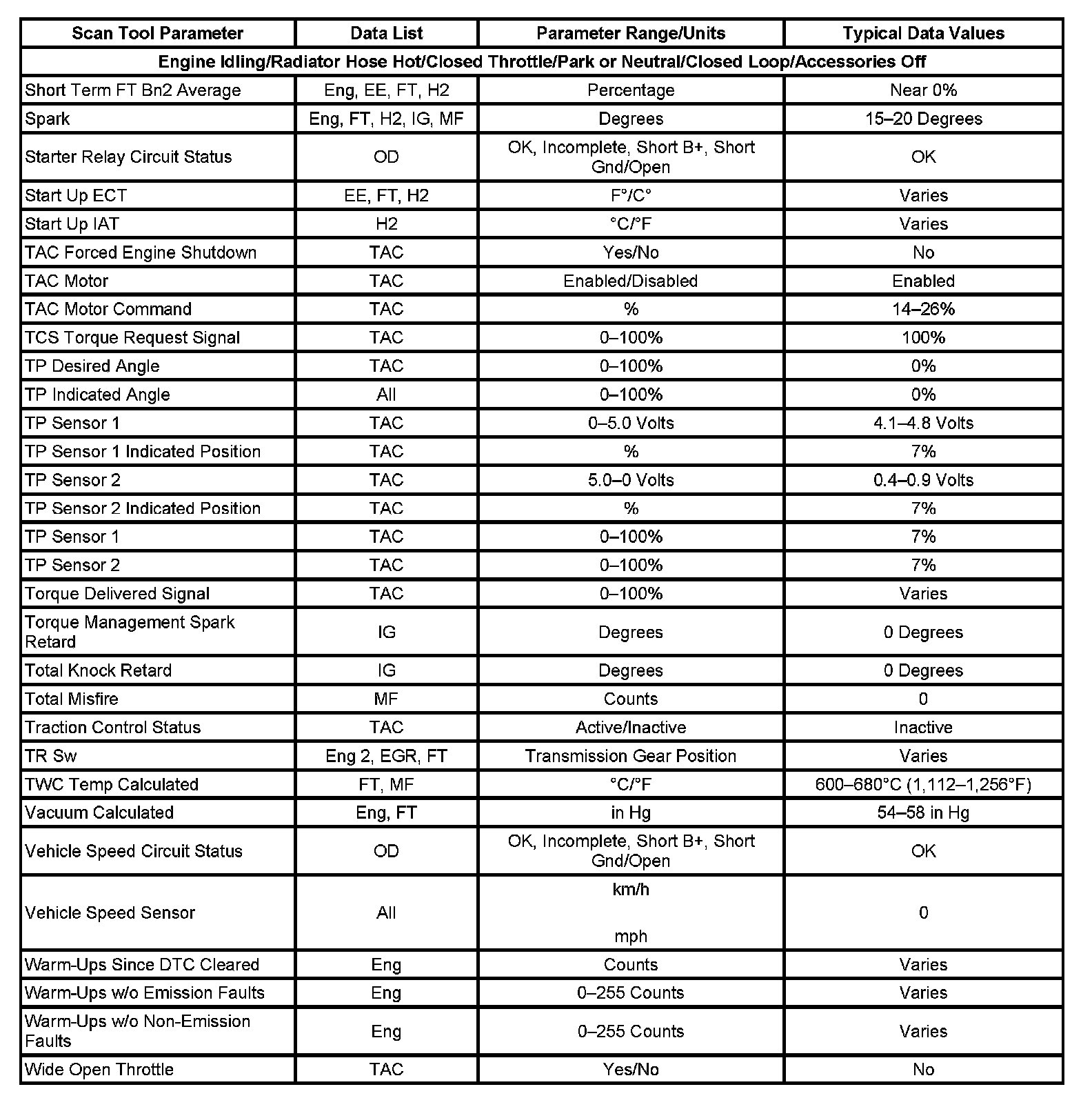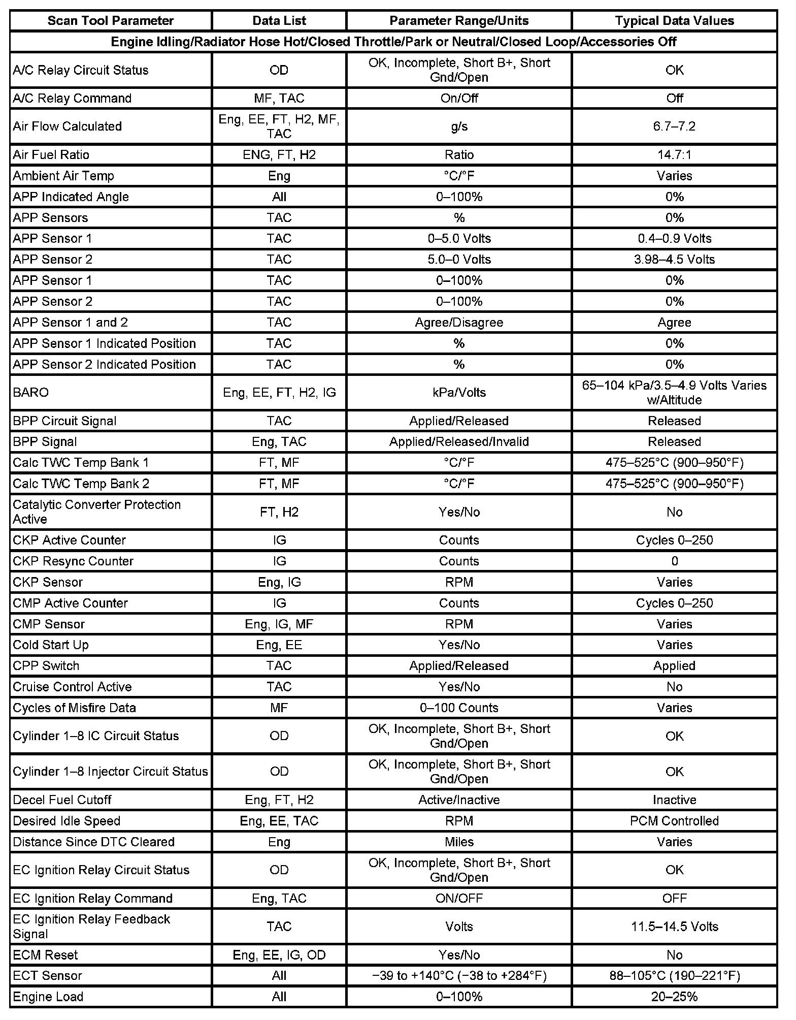 Scan tool values from a properly running engine may be used for comparison with the engine you are diagnosing. The Engine Scan Tool Data List represents values that would be seen on a normal running engine.