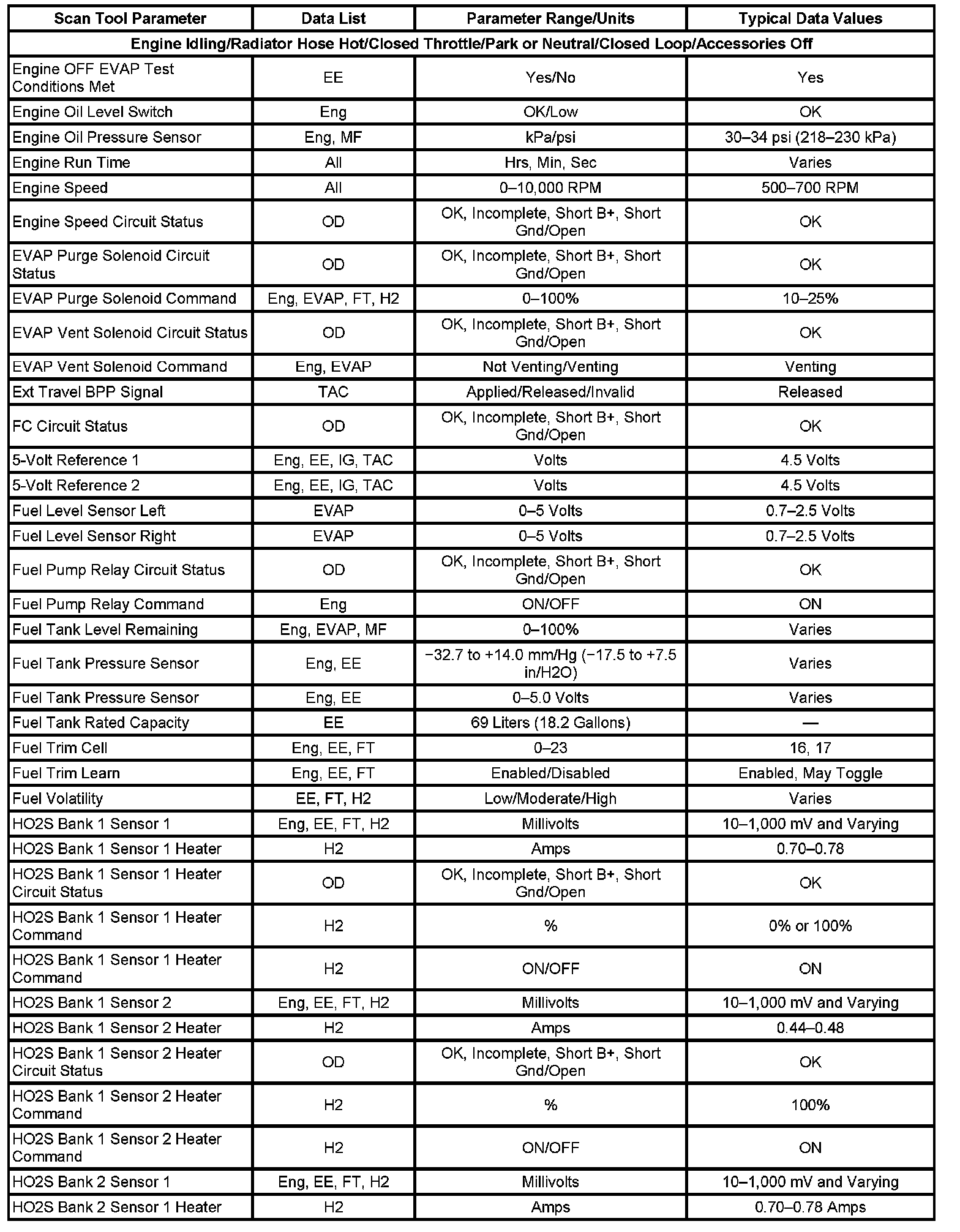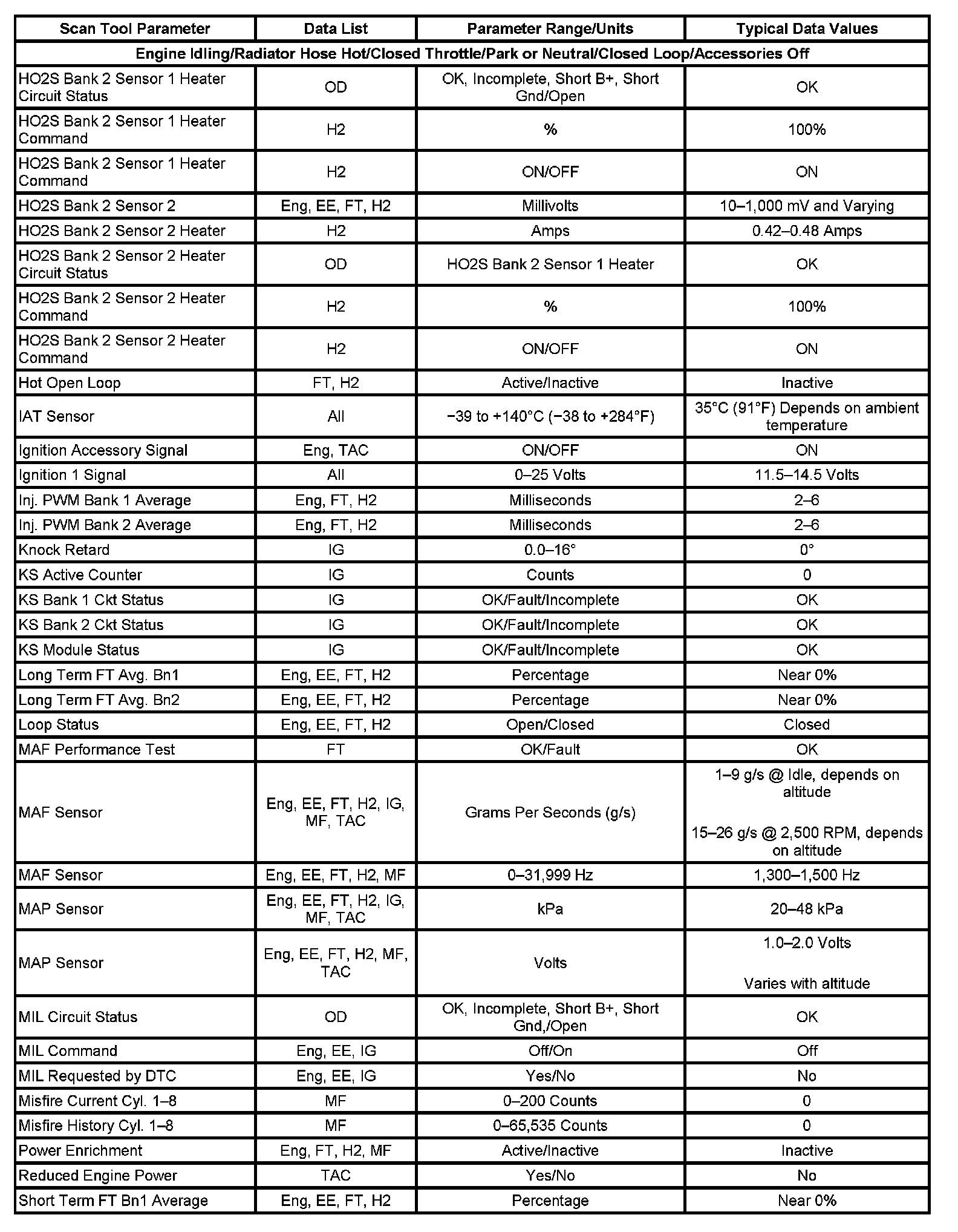 The Engine Scan Tool Data List contains all engine related parameters that are available on the scan tool. The list is arranged in alphabetical order. A given parameter may appear in any one of the data lists, and in some cases may appear more than once, or in more than one data list in order to group certain related parameters together.