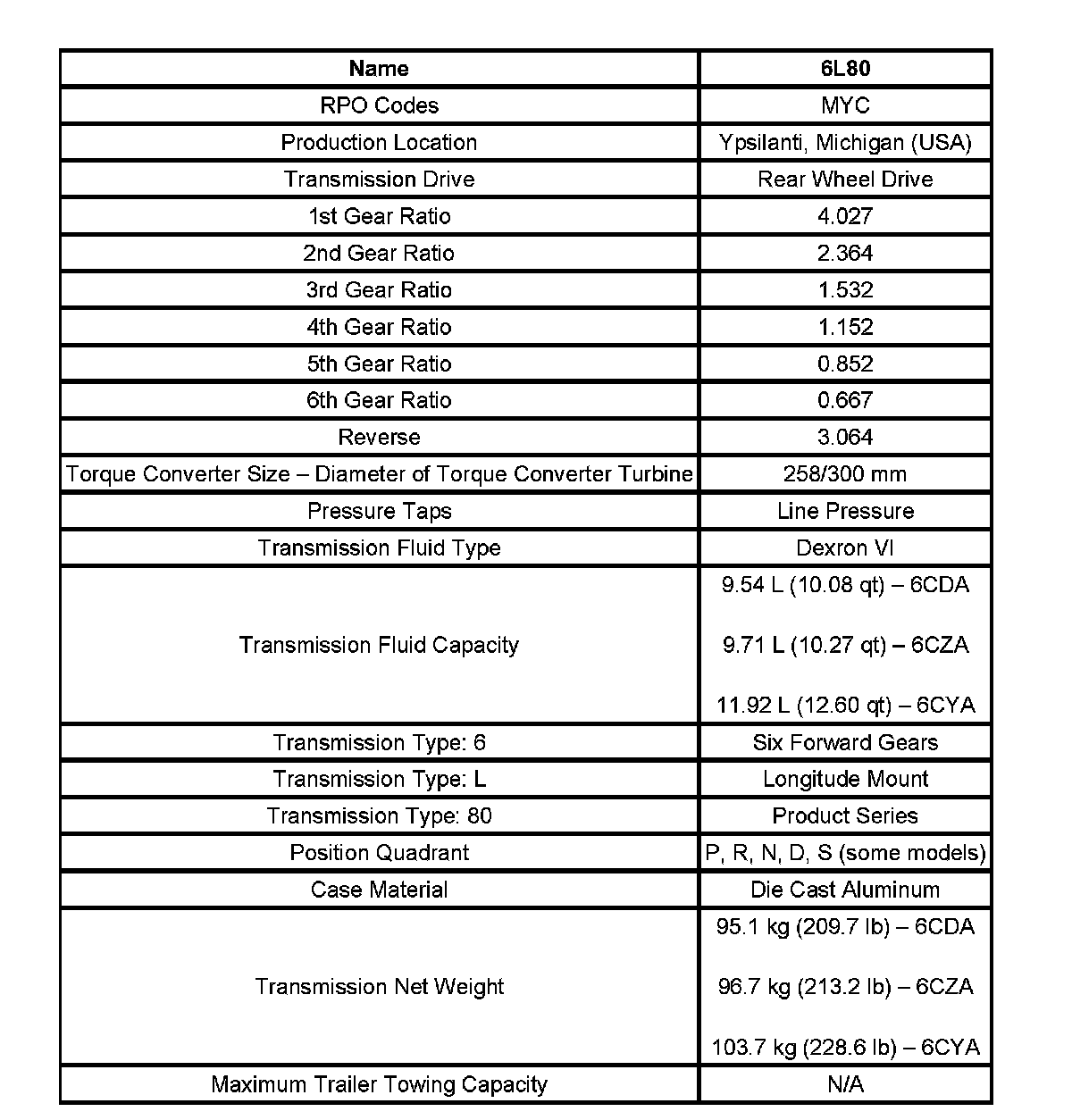 Transmission General Specifications: