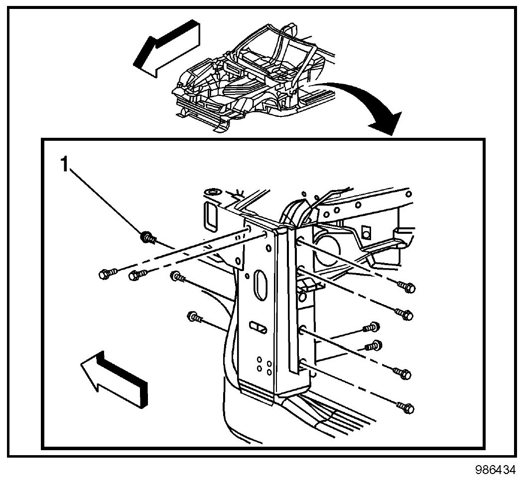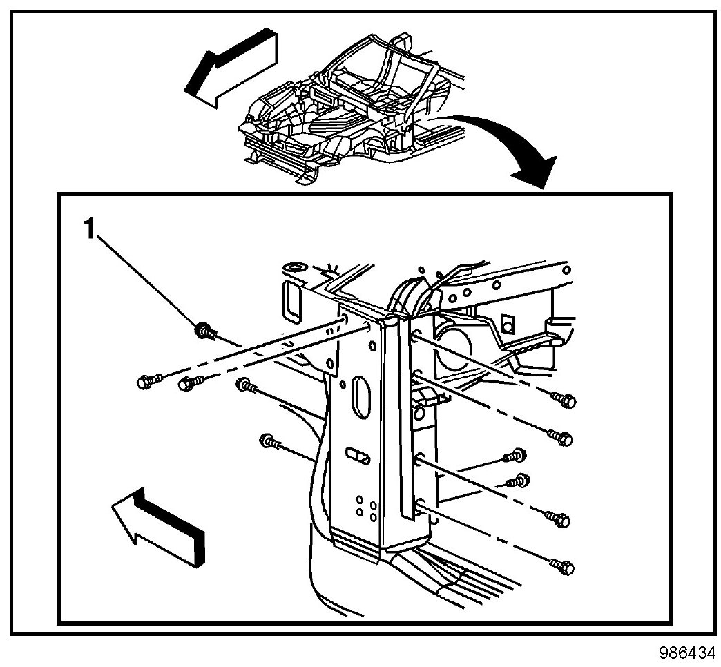 9. Remove the bolts (1) attaching the windshield frame to the front hinge pillars.