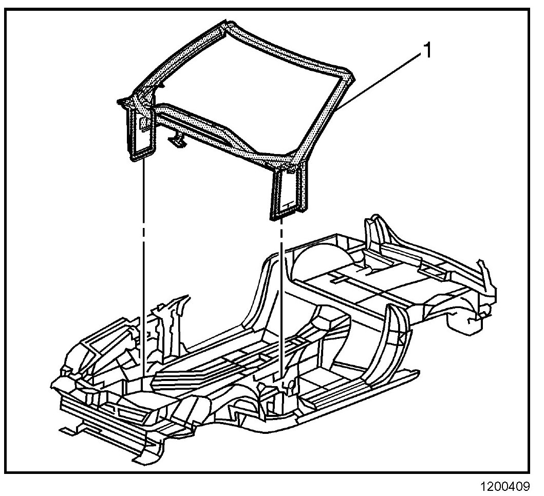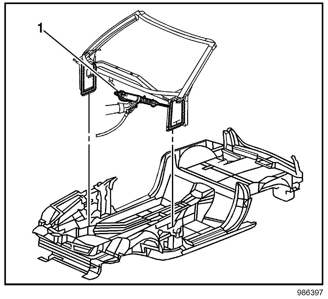 3. Apply a consistent bead of structural adhesive (1) 10 mm (3/8 in) in diameter to the windshield frame to mate with the bonding surfaces. Refer to Sheet Molded Compound (SMC) Panel Bonding.