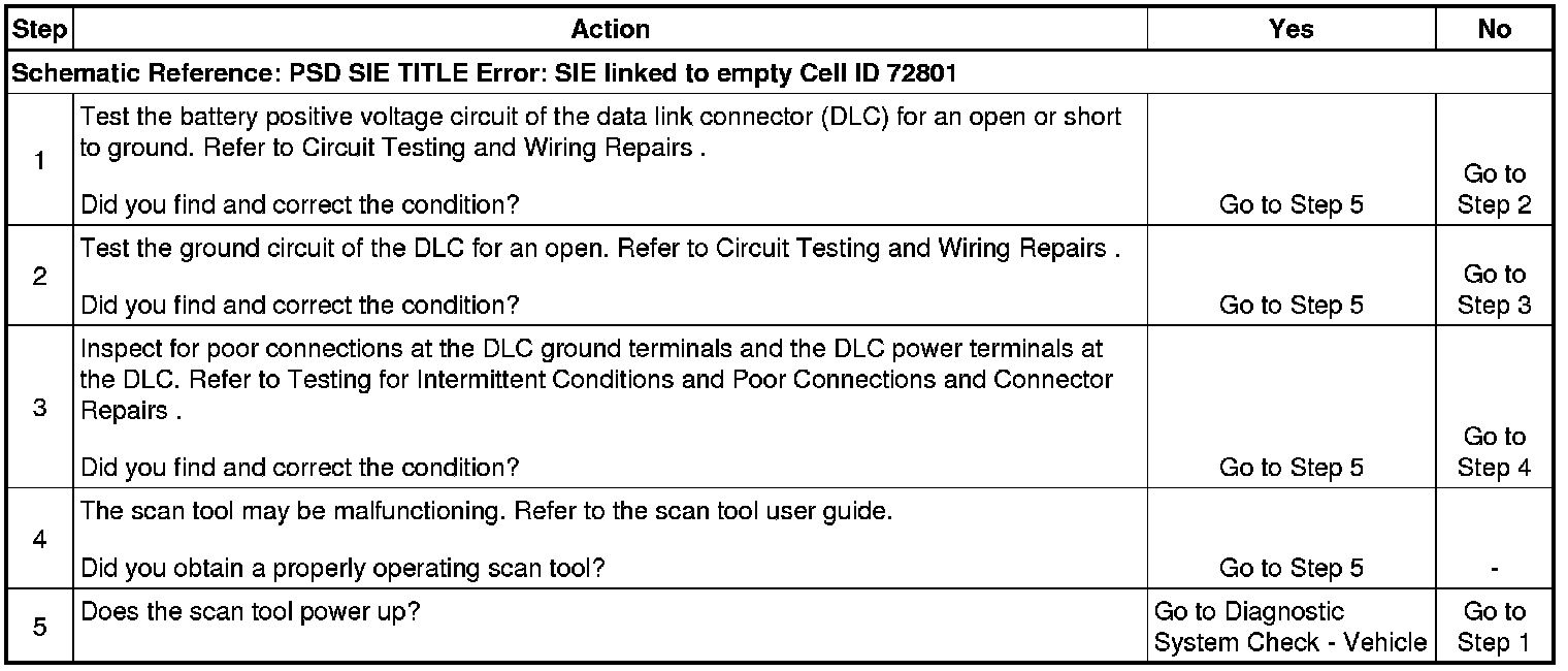 The data link connector (DLC) provides operating power for the scan tool at terminal 16. The ground for the scan tool is provided at terminal 4. The 16 pin DLC provides the serial data signals terminal 7 (ECM, TCM, ISU, EBCM), terminals 3 (2.5 L speed sensitive power steering), terminal 14 (2.0 l speed sensitive power steering), and terminal 13 (SIR serial data). The scan tool will power up with the ignition OFF. The ignition must be ON in order for the scan tool to communicate with a control module.
