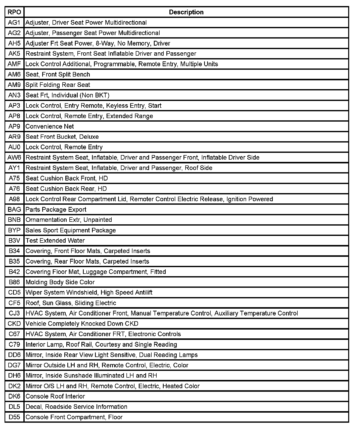 RPO Code List (Part 1):