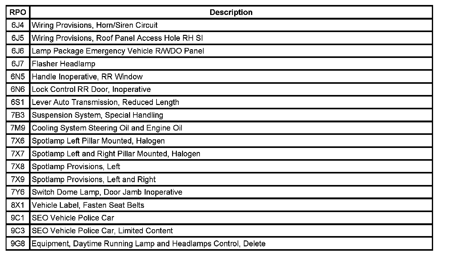 The table provides the description of the Regular Production Option (RPO) codes that are available on the vehicle. The vehicle's RPO list is printed on the Service Parts Identification Label.