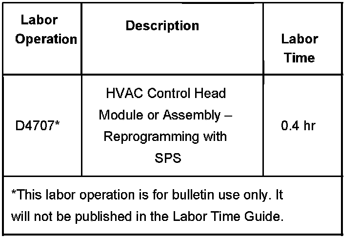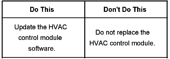 Technicians are to reprogram the HVAC control module with an updated software calibration. The new calibration was released beginning with TIS satellite data update version 6.5 which was made available on June 12, 2006. As always, make sure your Tech 2(R) is updated with the latest software version.